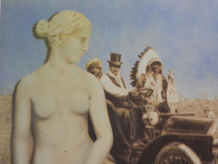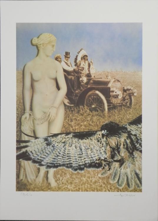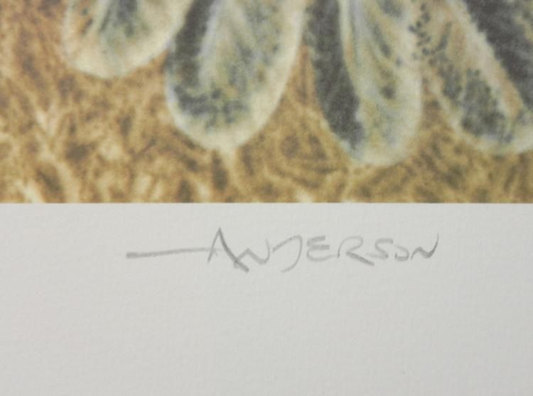Artist: Robert AndersonTitle: Hopelessly WatchingMedium: Litho print on paperSignature: Signed by artist, lower rightEdition: 193/250, lower leftImage size: 16" x 21 1/4" * Sheet size: 27 3/4" x 20" * Condition: ExcellentBiography * Robert Anderson's work has, in contrast to his refined photo-realist * technique, a definite, causal blu'e-jeaned feeling of the 60's and 70's. * Anderson also successfully combines imagery from different eras of * American history into modern muses and fantasies. His work has also been * called "Victoriana Revisited" which is a description of the subject * matter and overall atmosphere. All of Anderson's canvases are good to * look at, a quality that makes their offbeat manipulation of time and * space very acceptable. * * Anderson uses a soft focus airbrush technique. He uses shadows to * show that his foreground figures are not really part of their settings. * His combination of soft-edged and hard-edged techniques provoke the * viewer to wonder if all the elements are truly a part of the same scene. * Anderson's paintings are executed in a surrealist vein. Although they * celebrate people and faces in a realist way, the atmosphere they evoke * reaches into moods. * * The moods suggest mysteries of personality, character and the mind; * thus, one is confronted with a kind of uneasy psychological portrait * that transcends the visual, data of the features and body. The artist * achieves his pictorial ambiguity between the real and surreal by the * precision with which he depicts an individual and the uncertainty * suggested by bold, dark areas and the somewhat telepathic glances of his * subjects. * *Retrieved from: http://www.artrev.com/art/artists/biography.asp?aid=148&artist=Robert%20Anderson * *