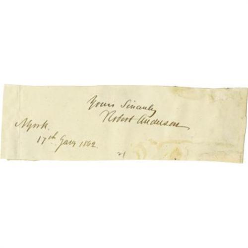 <B>Robert Anderson Signature</B></I> in full excised from a letter, 6" x 1.75". He has added "<I>Yours Sincerely</B></I>" and "<I>N York, 17th Jany 1862</B></I>" above and beneath respectively. Anderson was the commanding officer at Fort Sumter when Confederate forces led by General Beauregard, a former pupil of his at West Point, bombarded it. He was badly outnumbered and outgunned and finally surrendered the fort on the third day. This battle, of course, started the Civil War; Anderson was promoted due to his heroism. Interestingly, as a colonel of Illinois volunteers, Anderson had the distinction of twice mustering Captain Abraham Lincoln in and out of army service. Some mounting traces and one light fold, neither affecting signature. Fine condition. <I>From the collection of Henry E. Luhrs.</B></I><BR><BR><b>Shipping:</b> Flat Material, Small (<a target="_blank" href="http://www.heritageauctions.com/common/shipping.php">view shipping information</a>)