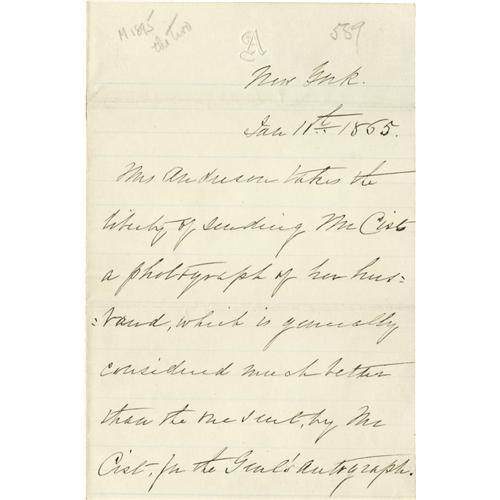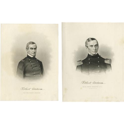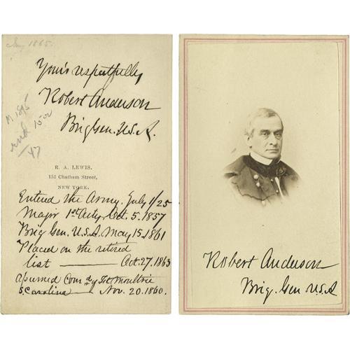 <B>Robert Anderson - Signed Photo and Signature</B></I> of the commanding officer who surrendered Fort Sumter, the battle that started the Civil War. Offered here is a fine group of items. First is a CDV signed on the front "<I>Robert Anderson Brig Gen U.S.A.</B></I>" and also on the back "<I>Your's [sic] respectfully Robert Anderson Brig Gen U.S.A</B></I>" above a handwritten history of his service in the Army. The second item is a clipped closing to a letter signed "<I>Respectfully, Your Obt Servt, Robert Anderson Maj Gen USA</B></I>" (ink smeared). Next is an ALS of transmittal from his wife, signed "<I>Mrs. Anderson</B></I>" in the third person, sending the CDV as requested to famous autograph collector and writer Lewis J. Cist. Also in this lot are two period engravings and a clipped contemporary article regarding the Fort Sumter battle. Except where noted, all in fine to Very Fine condition. Has original purchase invoice with handwritten note from Mary Benjamin, 1948. From the Henry E. Luhrs Collection. Accompanied by LOA from PSA/DNA.