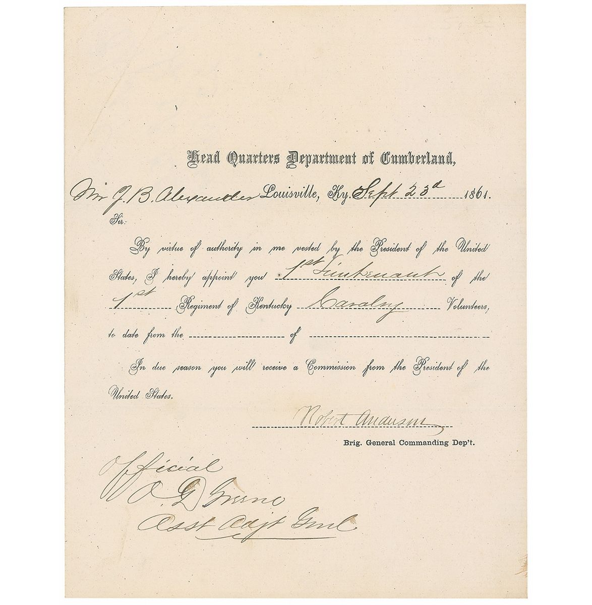 Union general (1805–1871) who commanded three United States forts: Castle Pinckney, Fort Moultrie, and Fort Sumter. In the face of South Carolina’s imminent secession, Anderson refused a formal demand for his surrender and in the early morning hours of April 12, 1861, Fort Sumter was bombarded, and the Civil War began. Partly-printed DS, one page, 7.5 x 9.75, September 23, 1861. An appointment for J. B. Alexander. In part, "Sir, by virtue of authroity in me vested by the President of the United States, I hereby appoint you 1st Liutenant of the 1st Regiment of Kentucky Calvary volunteers.” Signed at the conclusion by Anderson as brigadier general commanding. Document also bears a docketing notation to lower left. Diagonal creases to three corners, otherwise fine condition.