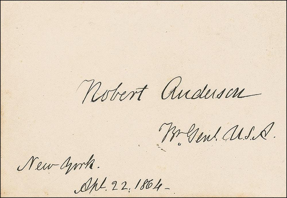 Union general (1805–1871) dubbed the “Hero of Fort Sumter” for refusing Confederate demands to surrender the fort and enduring two days of bombardment before finally submitting. Ink signature, “Robert Anderson, Br. Genl. U.S.A., New York, Apl. 22, 1864,” on an off-white 3.5 x 2.5 card. In fine condition, with a bit of trivial toning and soiling. RRAuction COA.