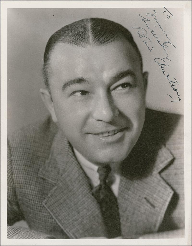 Actor (1890–1973) best remembered for his role as adventurer/filmmaker Carl Denham in the 1933 classic King Kong and its sequel, Son of Kong. Vintage matte-finish 7.75 x 10 photo of the smiling star, signed and inscribed in fountain pen “To Jimmy, Sincerely, Robert Armstrong.” In fine condition, with a couple tiny corner creases and a bit of staining at the extreme top and bottom right corners.