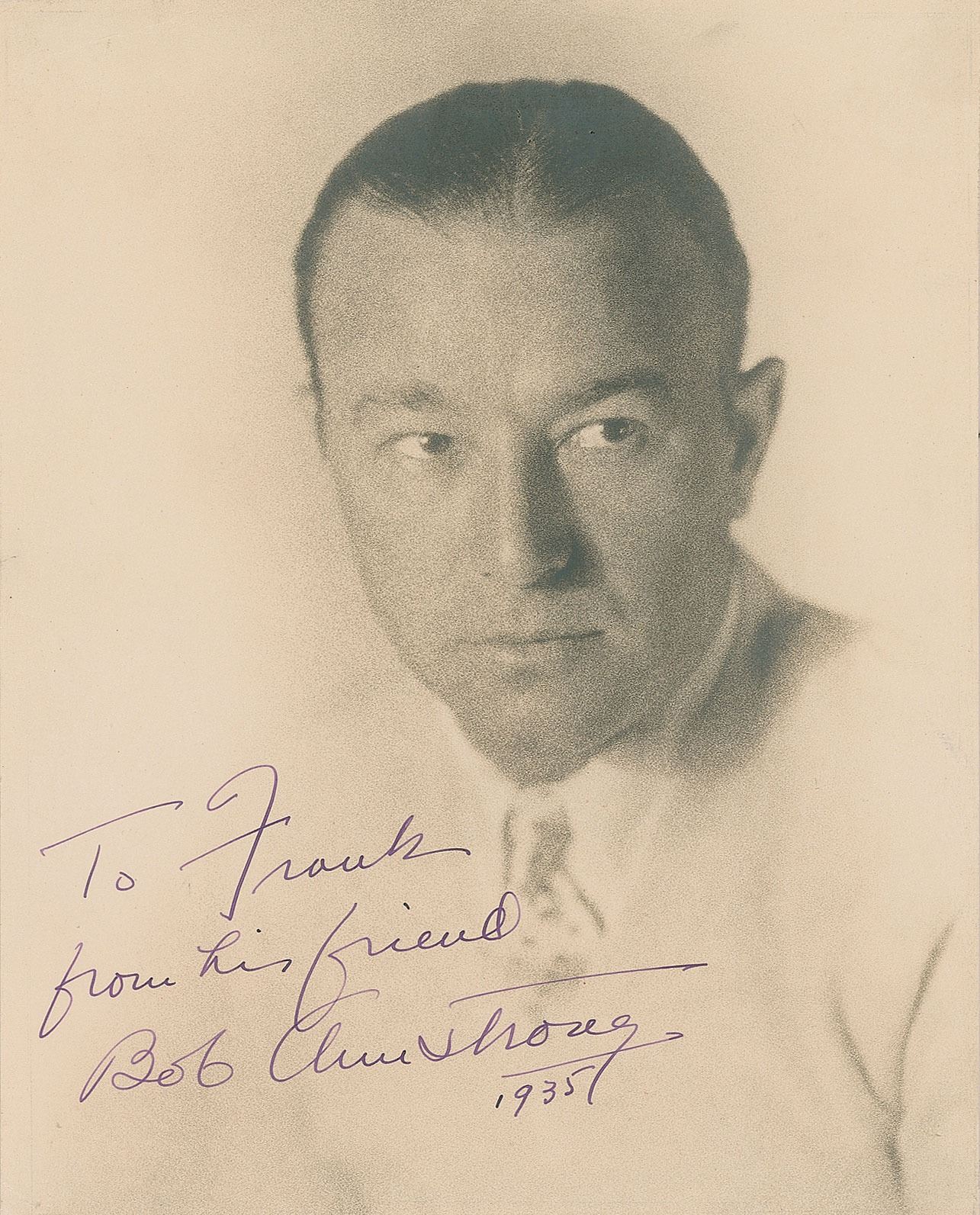 Actor (1890–1973) remembered for the role of adventurer/filmmaker Carl Denham in King Kong, a role he repeated in the same-year sequel, The Son of Kong. Vintage matte-finish 7.5 x 9.5 head shot photo of the actor, signed and inscribed in fountain pen, "To Frank, from his friend Bob Armstrong, 1935.” In fine condition, with a crease to the upper left corner and a somewhat grainy effect to the image.