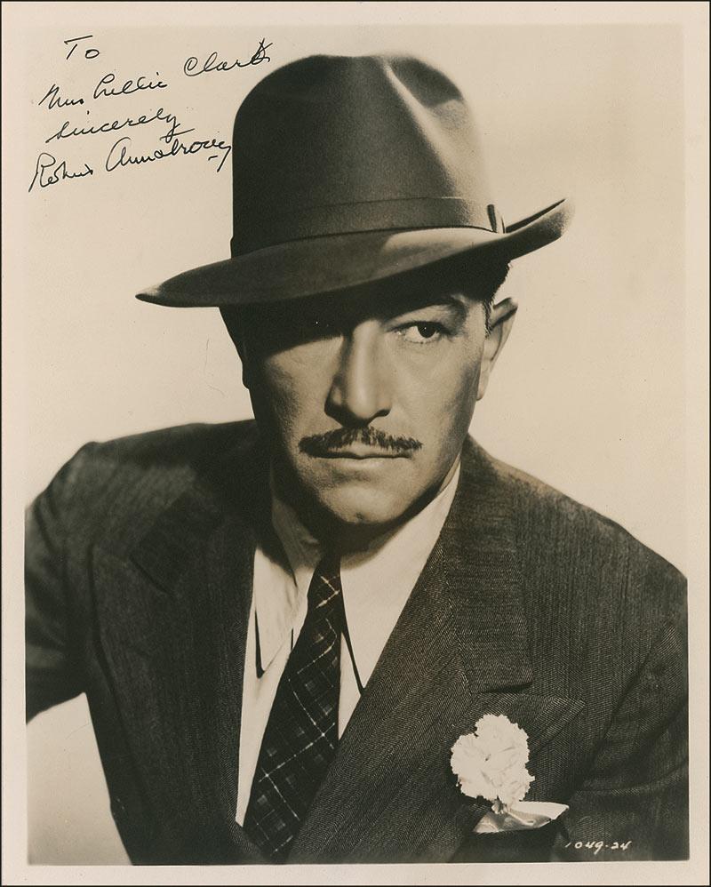 Actor (1890–1973) best remembered for his role as adventurer/filmmaker Carl Denham in the 1933 classic King Kong and its sequel, Son of Kong. Vintage matte-finish 8 x 10 photo of the sharply dressed actor wearing a fedora, signed and inscribed in black ink “To Mrs. Lillie Clark, Sincerely, Robert Armstrong.” In fine condition. Pre-certified PSA/DNA and RRAuction COA.