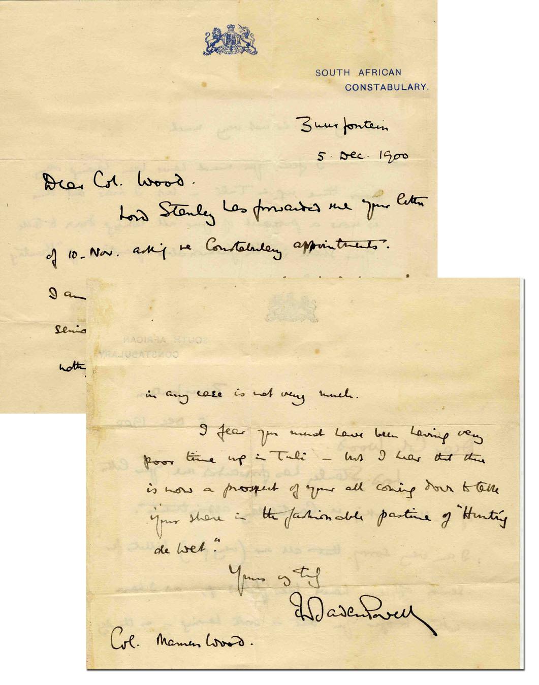 Robert Baden Powell autograph letter signed, composed on South African Constabulary stationery and dated 5 December 1900. Single page letter with writing on front and verso reads in part: ''…I am very sorry that all our (very few) billets for senior officers have been filled up, and I have nothing to offer you that is worth having - as the pay in any case is not very much…Yours truly, Baden Powell''. Letter measures 8.5'' x 7.5''. Slight adhesive mark to margin from removal from album, else very good condition.