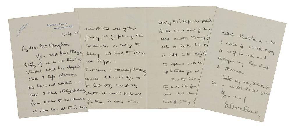 Ten page autograph letter signed ''R. Baden-Powell.'' The famous Boy Scout founder here writes to a Mrs. Vaughan about purchasing her library of books. On Farleyer House letterhead, dated 27 September 1905, Powell requests details of her library to decide if they will visit her to assess the value of her collection: ''...until they see a list they cannot say whether it would be possible for them to come without having their expenses paid.'' In fine condition. Accompanied by the original mailing envelope, addressed in Powell's hand.