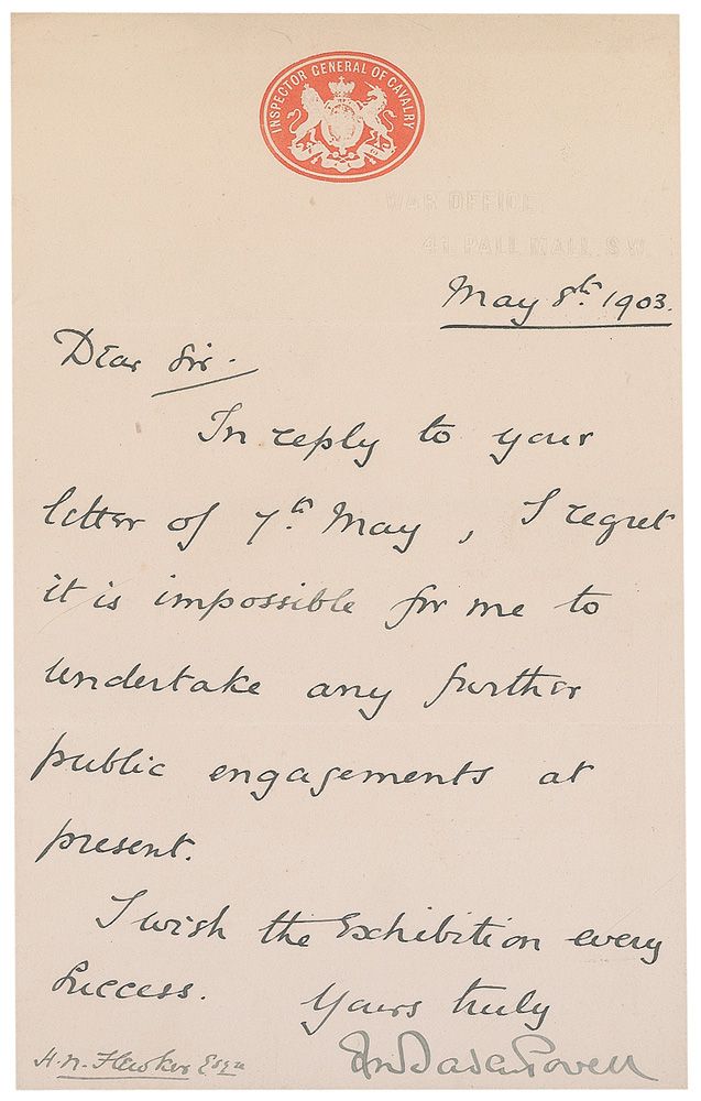 LS signed “R. Baden-Powell,” one page, 4.5 x 7, Inspector General of Cavalry letterhead, May 8, 1903. Letter to a gentleman. In part: “I regret it is impossible for me to undertake any further public engagements at present. I wish the exhibition every success.” In fine condition.