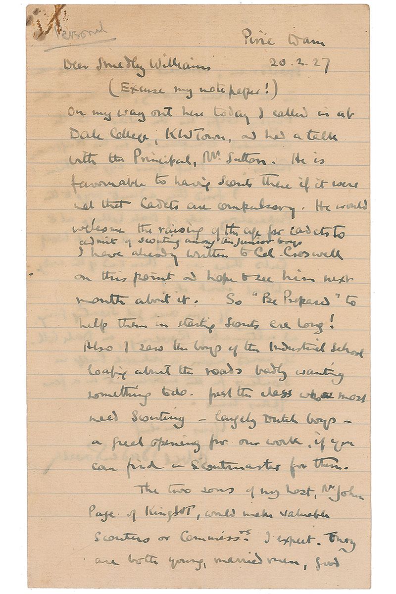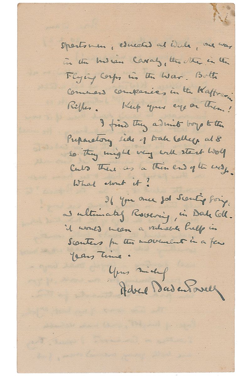 ALS, one page, lightly-lined both sides, 4.75 x 8, February 20, 1927. Letter to Lt. Colonel Smedley Williams, marked at the top, “Personal.” In full: “(Excuse my note paper!) On my way out here today I called in at Dale College, K W Town, and had a talk with the Principal, Mr. Sutton. He is favourable to having Scouts there if it were not that Cadets are compulsory. He would welcome the raising of the age for Cadets to admit of scouting among the junior boys. I have already written to Col. Croswell on this point and hope to see him next month about it. So ‘Be Prepared’ to help them in starting Scouts ere long! Also I saw the boys of the Industrial School loafing about the roads badly wanting something to do. Just the class who most need Scouting—largely Dutch boys—a great opening for our work, if you can find a Scoutmaster for them. The two sons of my host, Mr. John Page of Kings W T, would make valuable Scouters or Commissrs. I expect. They are both young, married men, good sportsmen, educated at Dale, one was in the Indian Cavalry, the other in the Flying Corps in the war. Both command companies in the Kaffraria Rifles. Keep your eye on them! I find they admit boys to the Preparatory side of Dale College at 8 so they might very well start Wolf Cubs there as a thin end of the wedge. What about it? If you once got scouting going, and ultimately Rovering, in Dale Coll. it would mean a valuable help in Scouters for the movement in a few years time.” In very good condition, with intersecting folds, a few creases, rusty staple hole to top left and toning to front page. In the fall of 1926, Baden-Powell travelled to South Africa hoping to iron out the racial tensions in the fledgling scouting movement there. Originally, it was proposed that Indians be allowed to become Scouts, but in segregated troops. This was unacceptable to Scouts in the Transvaal, where a separate movement for non-whites, called ‘Pathfinders,’ had been instituted. Facing heavy lobbying on both sides of the subject, efforts at compromise proved futile as, in 1931, the South African government created a youth movement for boys of Dutch descent—the Voortrekkers.