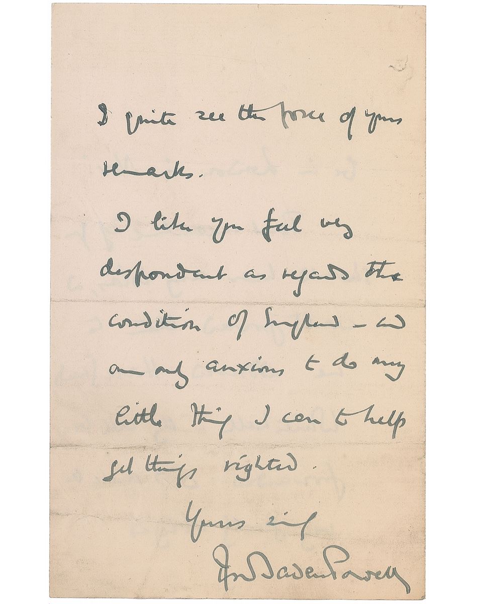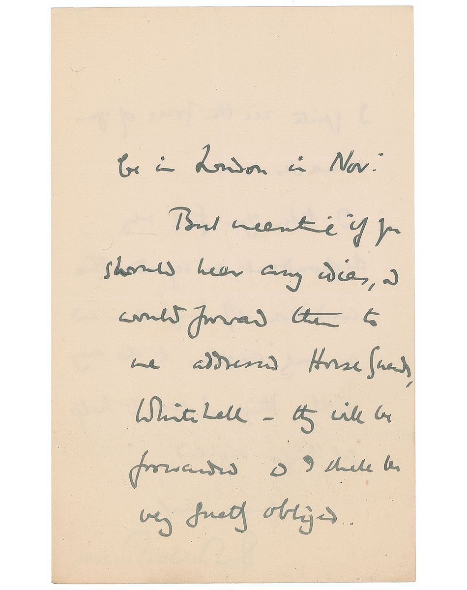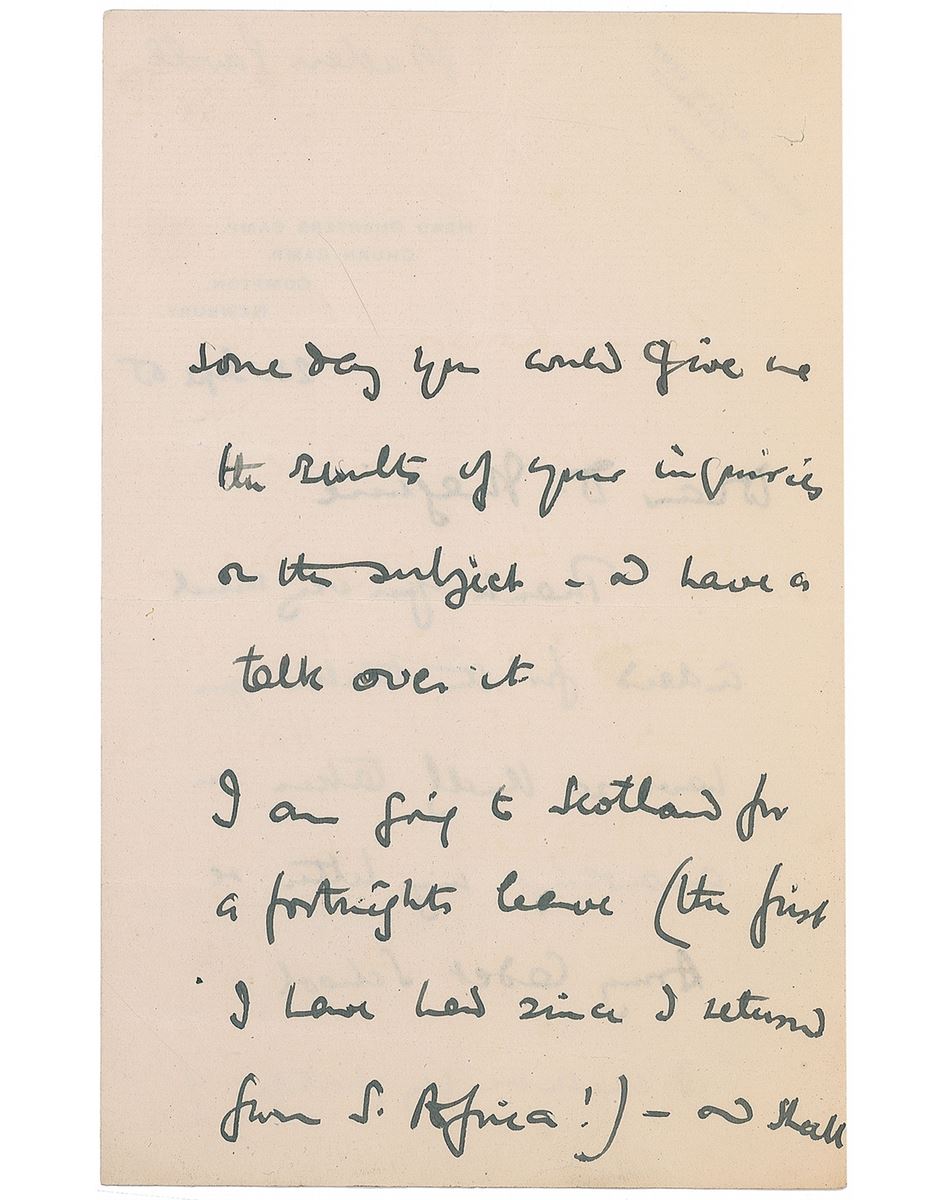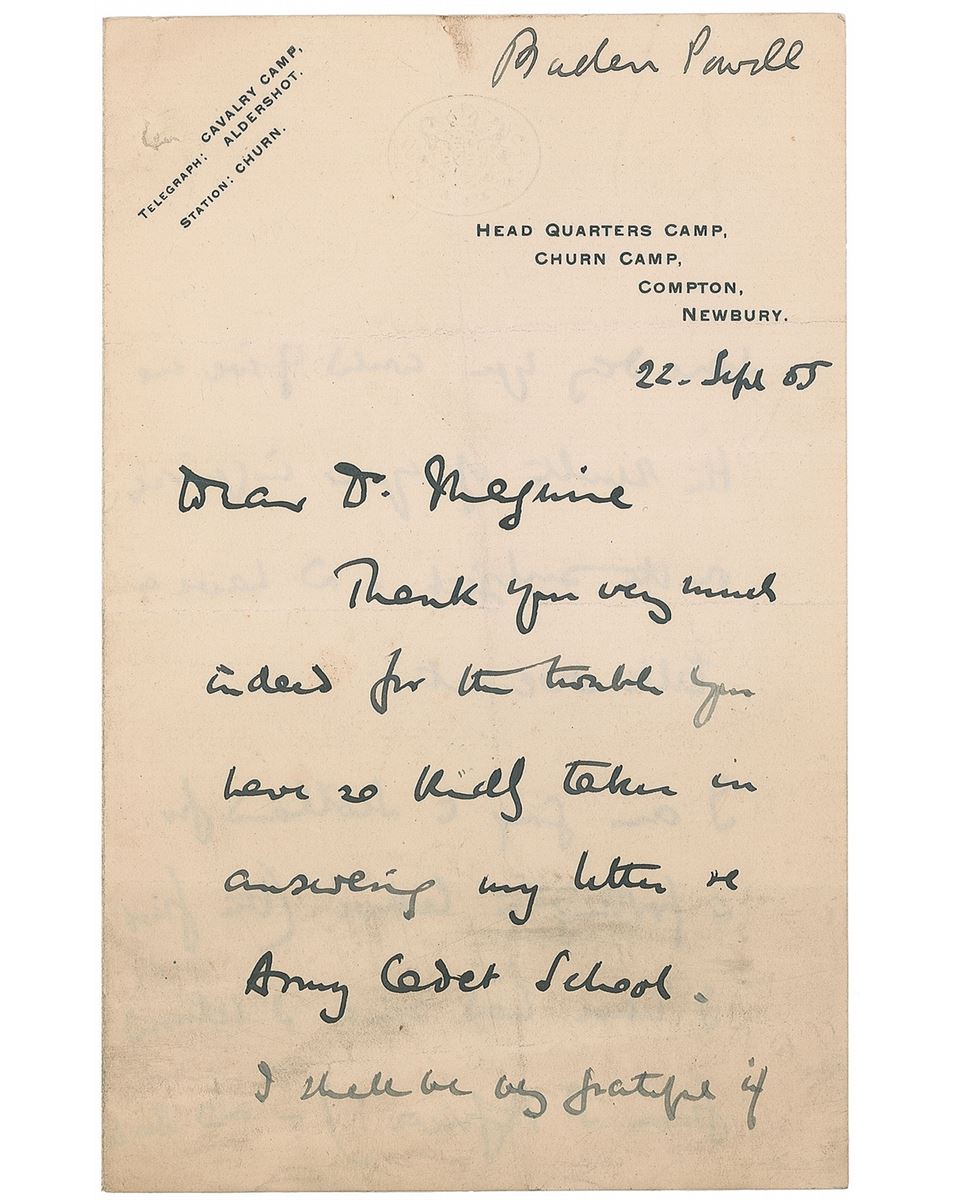ALS signed “R. Baden–Powell,” four pages on two adjoining sheets, 4.5 x 7.25, Head Quarters Camp, Newbury, letterhead, September 22, 1905. Letter to Dr. Maguire, in full: “Thank you very much indeed for the trouble you have so kindly taken in answering my letter re Army Cadet School. I shall be very grateful if some day you could give me the results of your inquiries on the subject—& have a talk over it. I am going to Scotland for a fortnights leave (the first I have had since I returned from S. Africa!—& shall be in London in Nov. But meantime if you should hear any ideas, & could forward them to me addressed Horse Guard, Whitehall—they will be forwarded & I shall be very greatly obliged. I quite see the force of your remarks. I, like you, feel very despondent as regards the condition of England—and am only anxious to do any little thing I can to help get things righted.” A collector’s notation identifying Baden–Powell is penned at the top. Intersecting folds, mild soiling, a small hole to upper left, and portions of writing a shade light, otherwise fine condition.