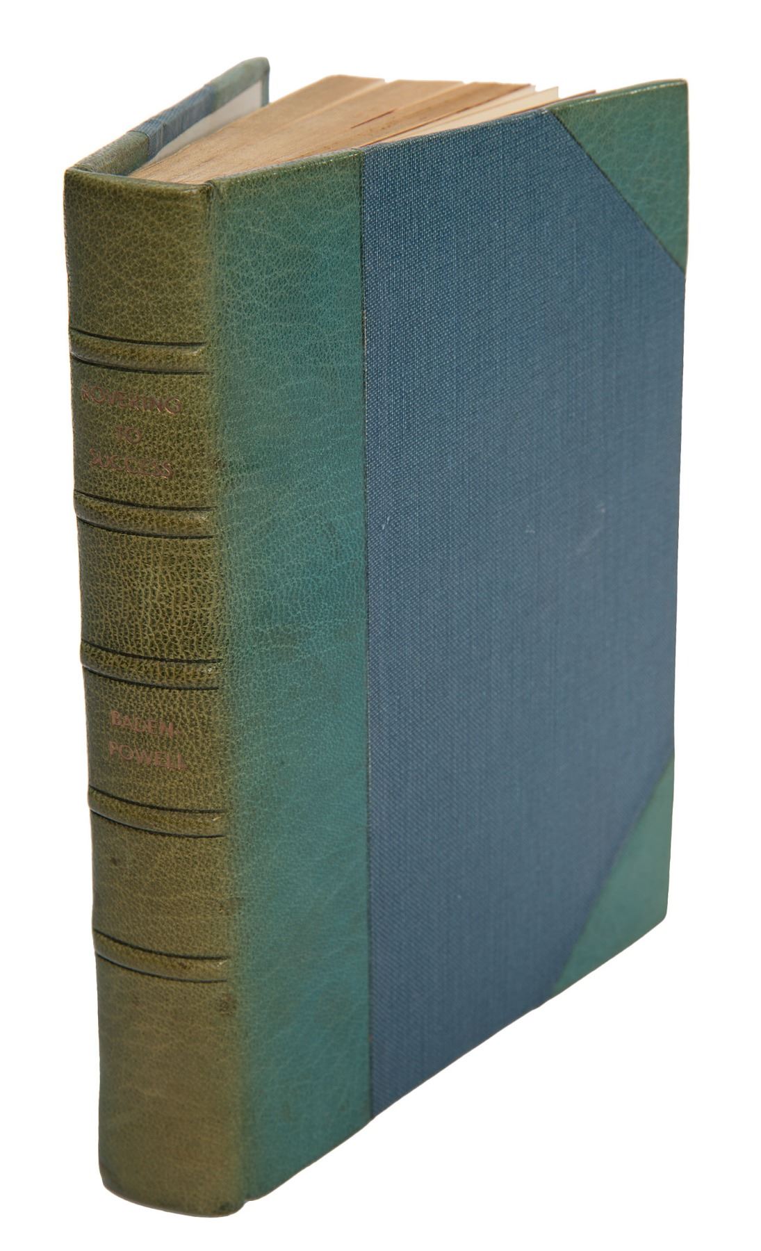 Signed book: Rovering to Success. Twelfth printing. London: Herbert Jenkins. Custom-bound hardcover in three-quarter leather, 5 x 7.25, 247 pages. Boldly signed on the marbled endpaper in ink, "Baden Powell of Gilwell, 1939." In fine condition, with sunning to the spine, an ownership signature above Baden-Powell's, and a gift inscription to the half-title page.