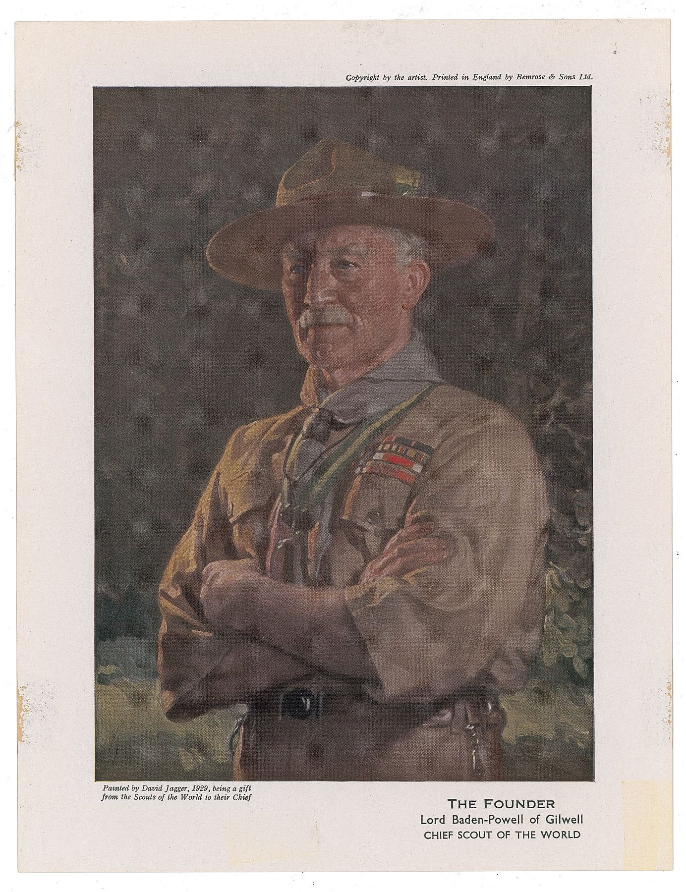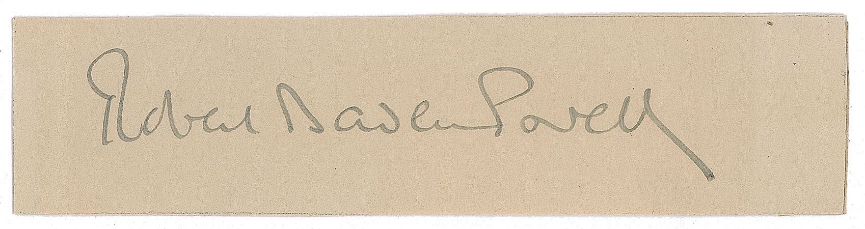 British military officer and founder of the world scouting movement (1857–1941). Fountain pen signature, "Robert Baden-Powell,” on an off-white 4 x 1 slip. In fine condition, with a light paperclip impression touching the first name. Accompanied by an unsigned color print of the scout leader.