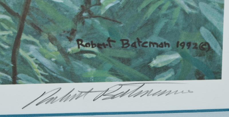 Depicting a mountain gorilla within a forest, pencil signed and dated 1992 in LR, #323/2250. Nicely framed and matted, 32" H x 42.5" W (including frame), with original paperwork and certificate.