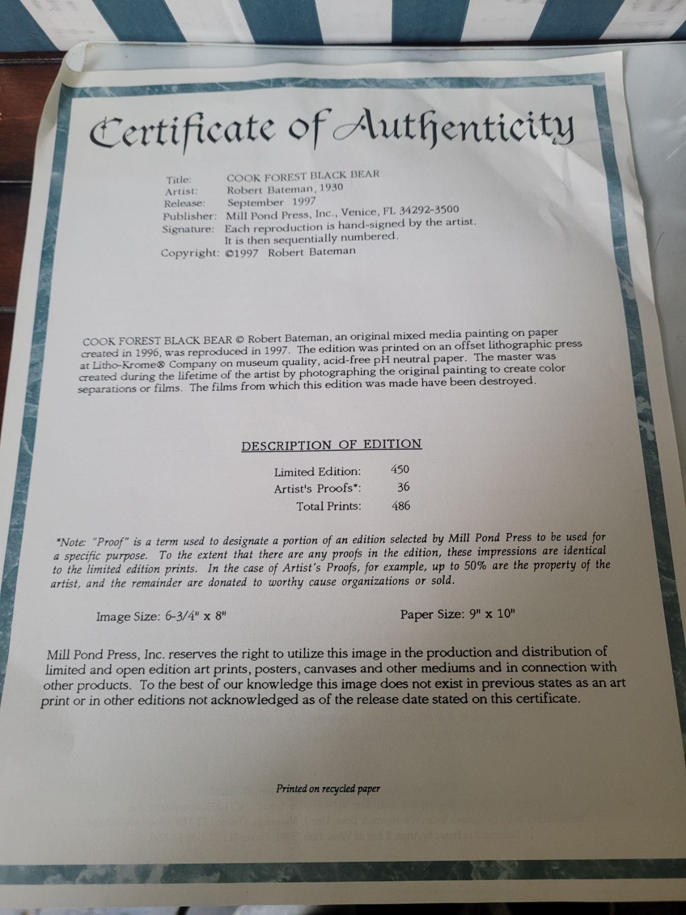 Cook Forest Black Bear 227/450 C.O.A. 19x19 Pickup at 10 am