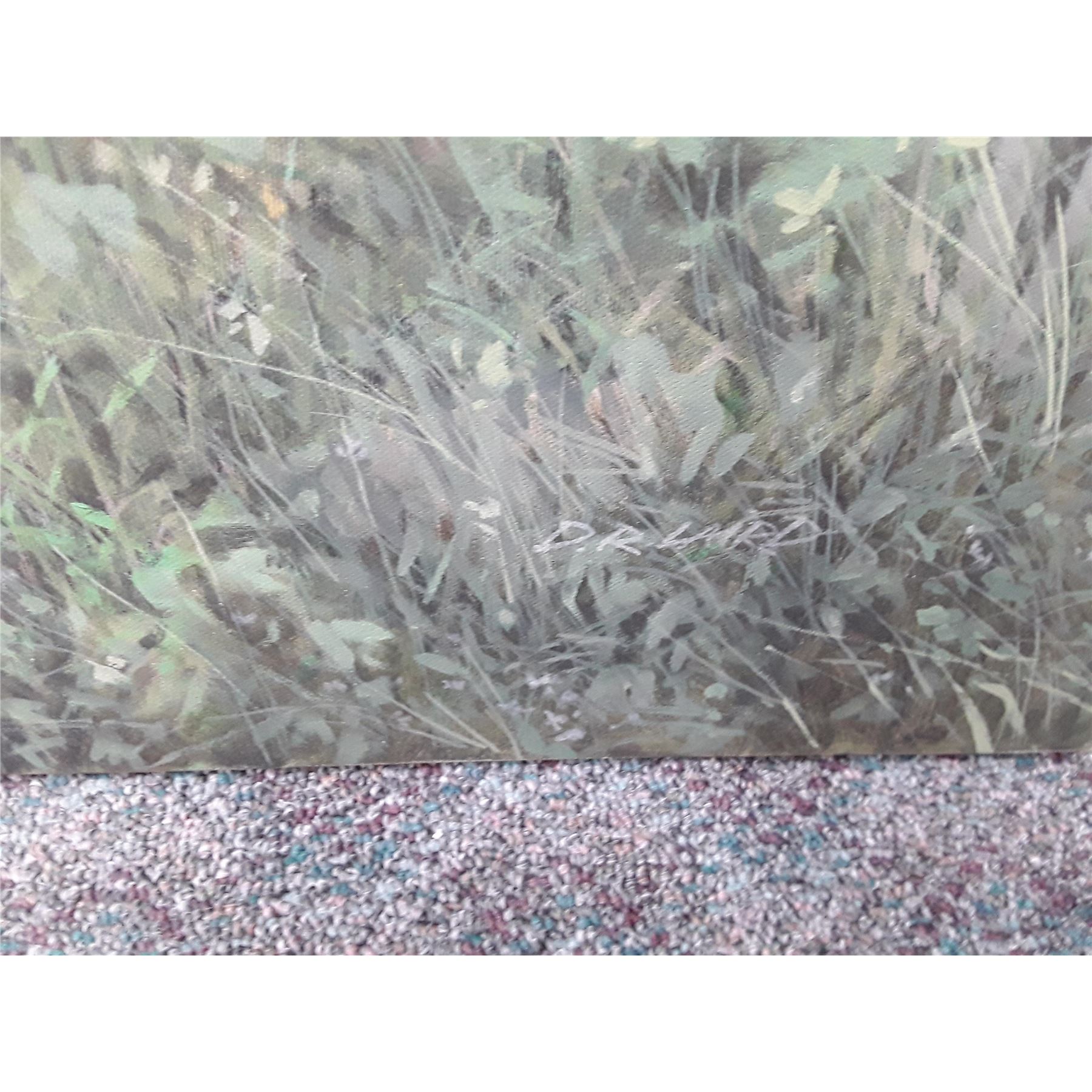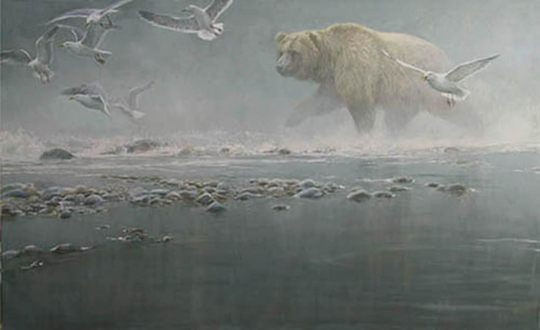Robert Bateman's "Above The Rapids - Gulls And Grizzly" limited edition canvas signed and numbered of an edition of 180. This canvas is in mint condition and has never been framed. "Although I have not shown a salmon in this painting, you know that they are there. Some are in the quiet water above the falls and others are still fighting their way upstream. This is why the grizzly bear and gulls are there. This is the banquet time so important to these species and many others. It is a far-ranging crime against nature and against us to jeopardize the spectacular wild salmon." - Robert Bateman. 23" x 37".