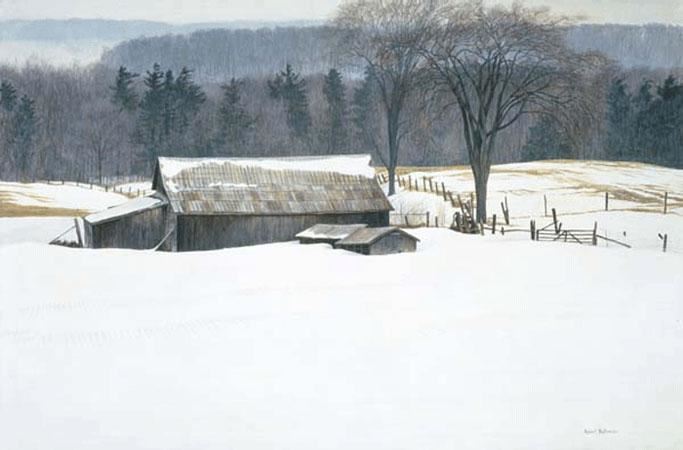 Robert Bateman's "Along Walkers Line" limited edition canvas signed and numbered of an edition of 180. This canvas is in mint condition and has never been framed. "My transformation from an abstract artist to realist style painter happened after seeing an exhibition of Andrew Wyeth paintings. The rural countryside around Chadd's Ford, Pennsylvania, which Wyeth depicted, was very similar to the area where I chose to live ... a world of traditional family farms and scattered forests. Here was an artist who used abstract forms in his compositions but cared about the particularity of the actual surface of his world. In this painting I examined the texture of the ploughed field etched by snow and the rolling forms of the forest in winter." - Robert Bateman. 24" x 36".