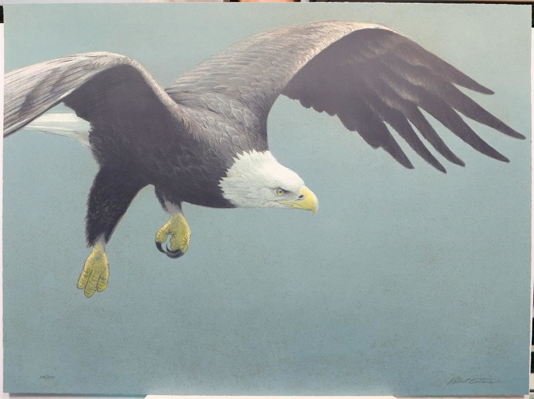 Robert Bateman's "Approach - Bald Eagle" limited edition original lithograph signed and numbered 280/290. This print is in mint condition and has never been framed. "It is a never-ending thrill to live in bald eagle country. The greatest thrill is to be lucky enough to see the approach. The soaring changes to a heavy, flapping beat. At the last moment, the legs and feet come down like landing gear on an aircraft. And our hearts always beat a little faster at this display of elegance and power." - Robert Bateman. 28 3/4" x 38".