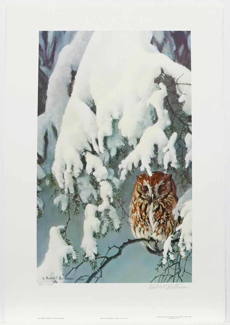 Robert Bateman's "Asleep in The Hemlock - Screech Owl" limited edition print signed and numbered 821/950. This print is in mint condition and has never been framed. "One of our smaller owls, the screech owl is never active in daytime but rests in a hollow tree, old building or on some concealed bough. This one is sleeping in one of his favorite roosts, a hemlock tree." - Robert Bateman. 20 1/2" x 12 1/2"