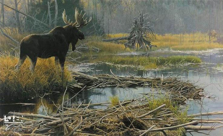 Robert Bateman's "Autumn Overture - Moose" limited edition canvas signed and numbered of an edition of 250. This canvas is in mint condition and has never been framed. "As the days shorten with the coming of winter, the leaves have mostly fallen, but the grasses still glow gold and green. While much life is slowing down, the moose is becoming his most vigorous. Perhaps this bull has heard the mating call of a cow." - Robert Bateman. 30" x 48"