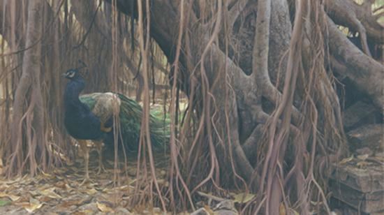 Robert Bateman's "Banyan Walk - Peacock" limited edition canvas signed and numbered of an edition of 180. This canvas is in mint condition and has never been framed. "The spectacular peacock is still holding its own in the wild. It is astonishing to see this most sensational of all birds flying through the trees, trailing his tail like an exotic magic carpet. I have shown this bird cautiously stepping along an overgrown path under a banyan tree." - Robert Bateman.
