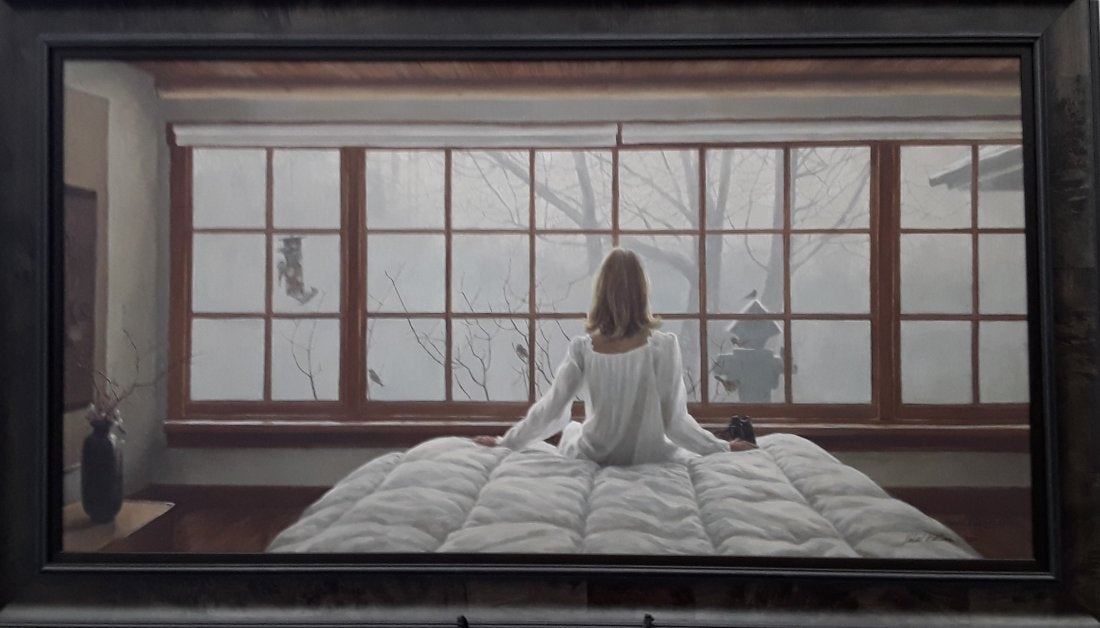 "Birgit and I start our day with one luxury. We each make a simple fruit and cereal breakfast, take it back to our bedroom and sit up on our bed to eat it. But the luxury part is looking out the window. We have a bucolic view of the big leaf maple, meadow and forest with a little lake. However, the real ever-changing joy is the visitors to the bird feeders. Sometimes, flocks, sometimes one or two and of course they change with the seasons. We have seen over a dozen species at the feeders and occasionally we have a bird feeder, a sharp-shinned hawk might take a siskin. But as with most predators, they miss 9 times out of 10. In this painting I have shown Birgit perched on the end of the bed after breakfast, checking the identity of a difficult finch. We realize that feeding the birds is controversial in some circles. We pretend we do it for the birds but really we do it for us." - Robert Bateman. Image- 24" x 37 1/2". Frame- 31" x 55".