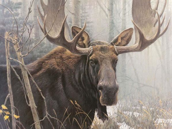 Robert Bateman's "Bull Moose - Renaissance Edition" limited edition canvas signed and numbered of an edition of 180. This canvas is in mint condition and has never been framed. "The first snows of winter find the bull moose in peak condition. His antlers have been cleared of the ragged velvet left over from the summer growing, and his coat has reached its thick and glossy prime. He is also in a fighting mood and a dangerous animal even though the rutting season is over." - Robert Bateman. 30" x 40".