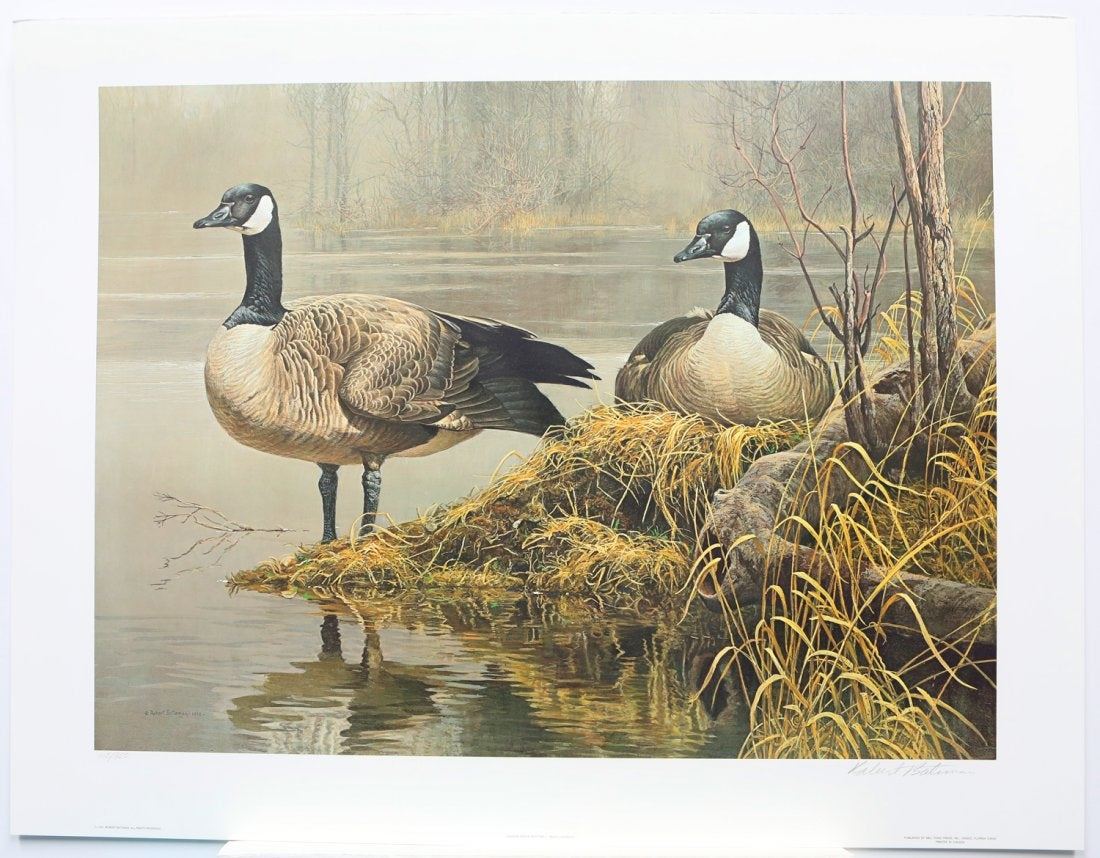 Robert Bateman's "Canada Geese Nesting" limited edition print signed and numbered 115/950. This print is in mint condition and has never been framed. "Canada geese, for me, are symbols of fidelity and territoriality. I see them as forceful, direct birds. In this painting I was thinking about the bond between the two and have shown the male on guard, watchful and alert, and the female on the nest."- Robert Bateman. 24" x 31"