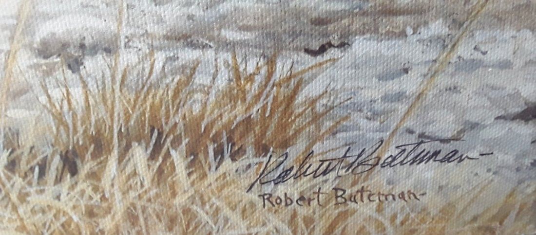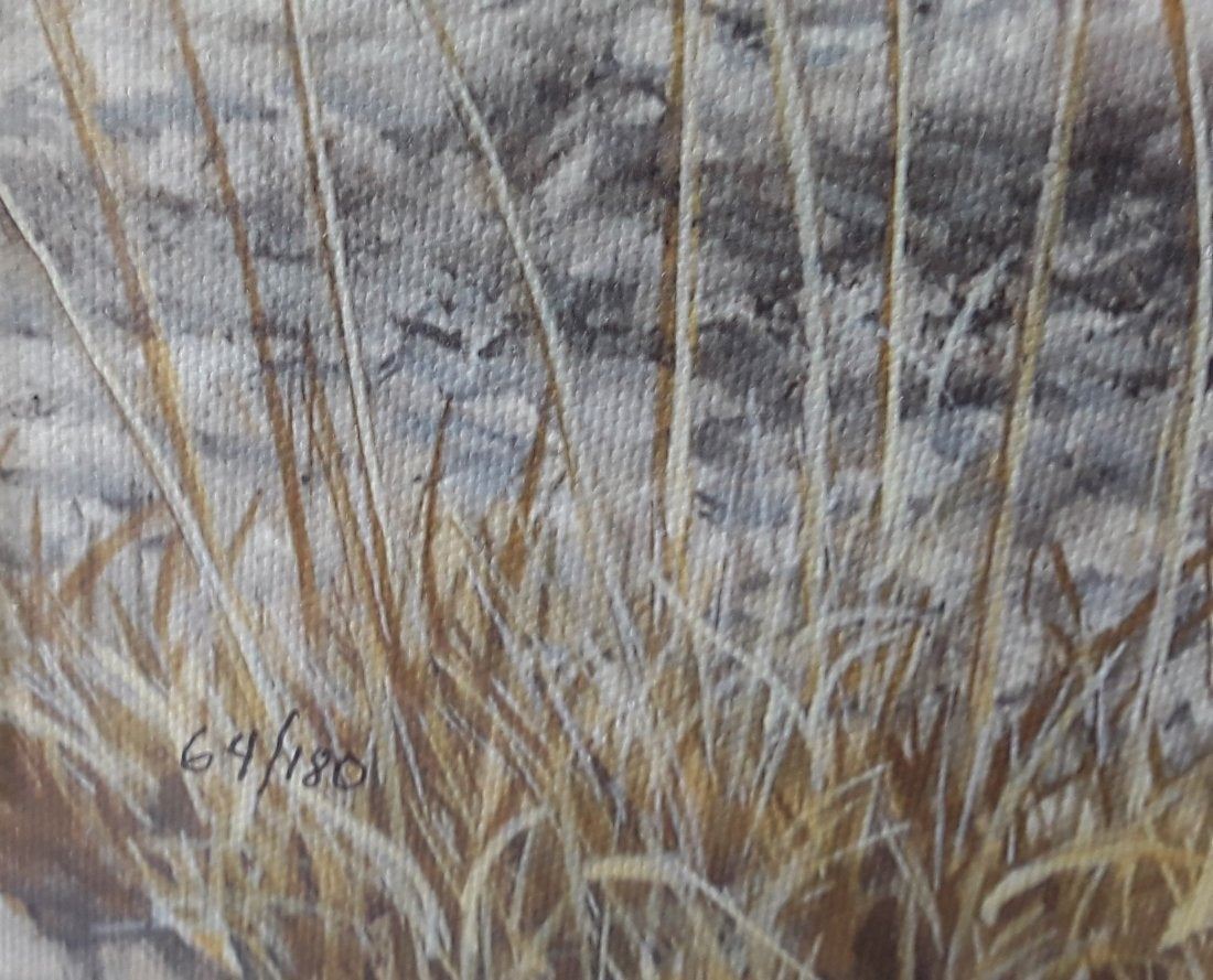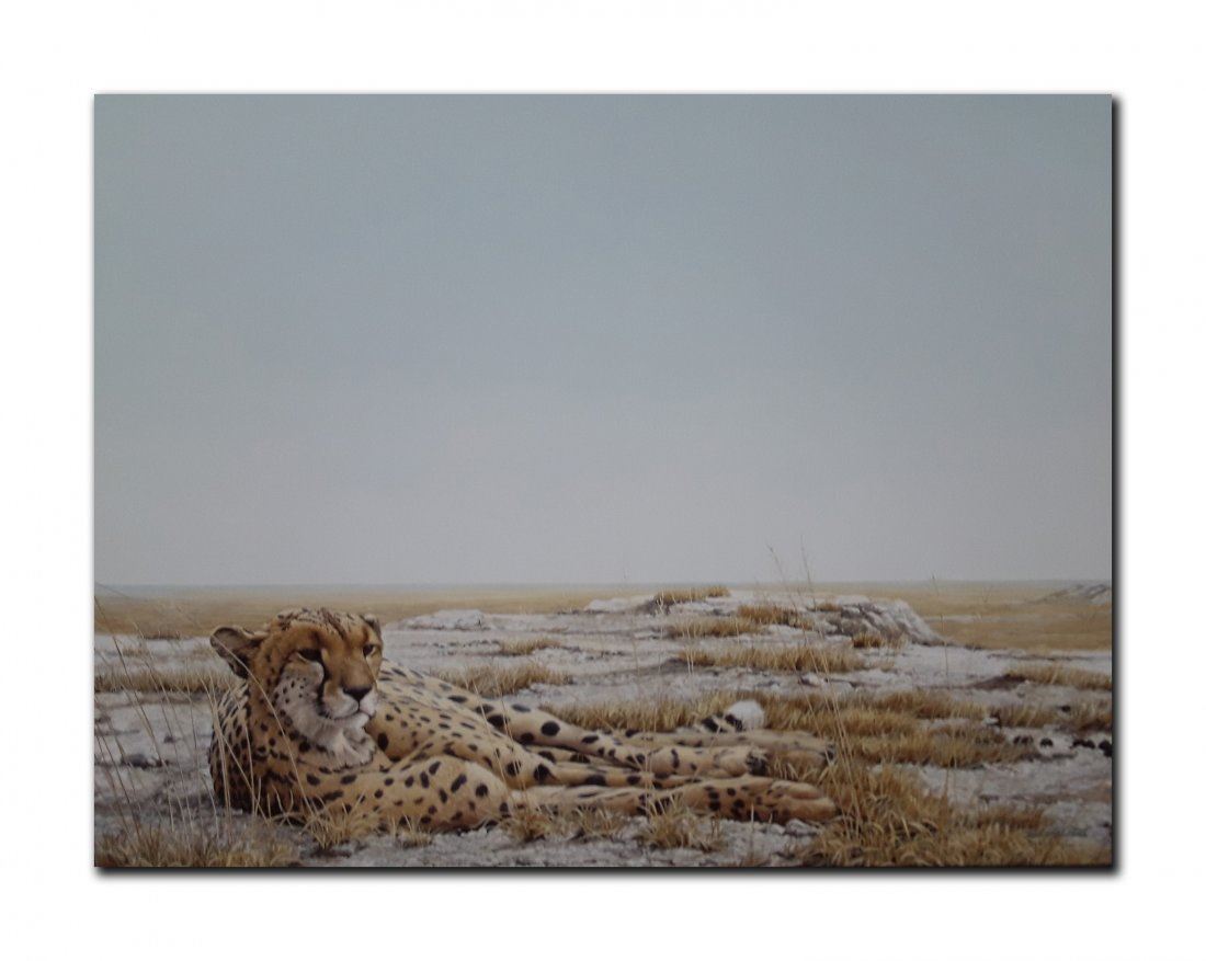 "In the big-game country of Africa I am always aware of the huge, overpowering, blue sky, especially at places like the Amboseli plain in southern Kenya, shown here in Cheetah Siesta. I wanted to feel the presence of the sky in this picture, but I had to be persuaded by my wife, Birgit, that I could put the horizon as low as it is and still have room for the cheetah and the plain. I also had to resist the temptation to let more tall grasses stretch across the horizon, or to introduce a cruising vulture in the distant sky. By leaving it empty, the sky becomes as strong a force in the picture as the cheetah itself." - Robert Bateman. 30" x 40".