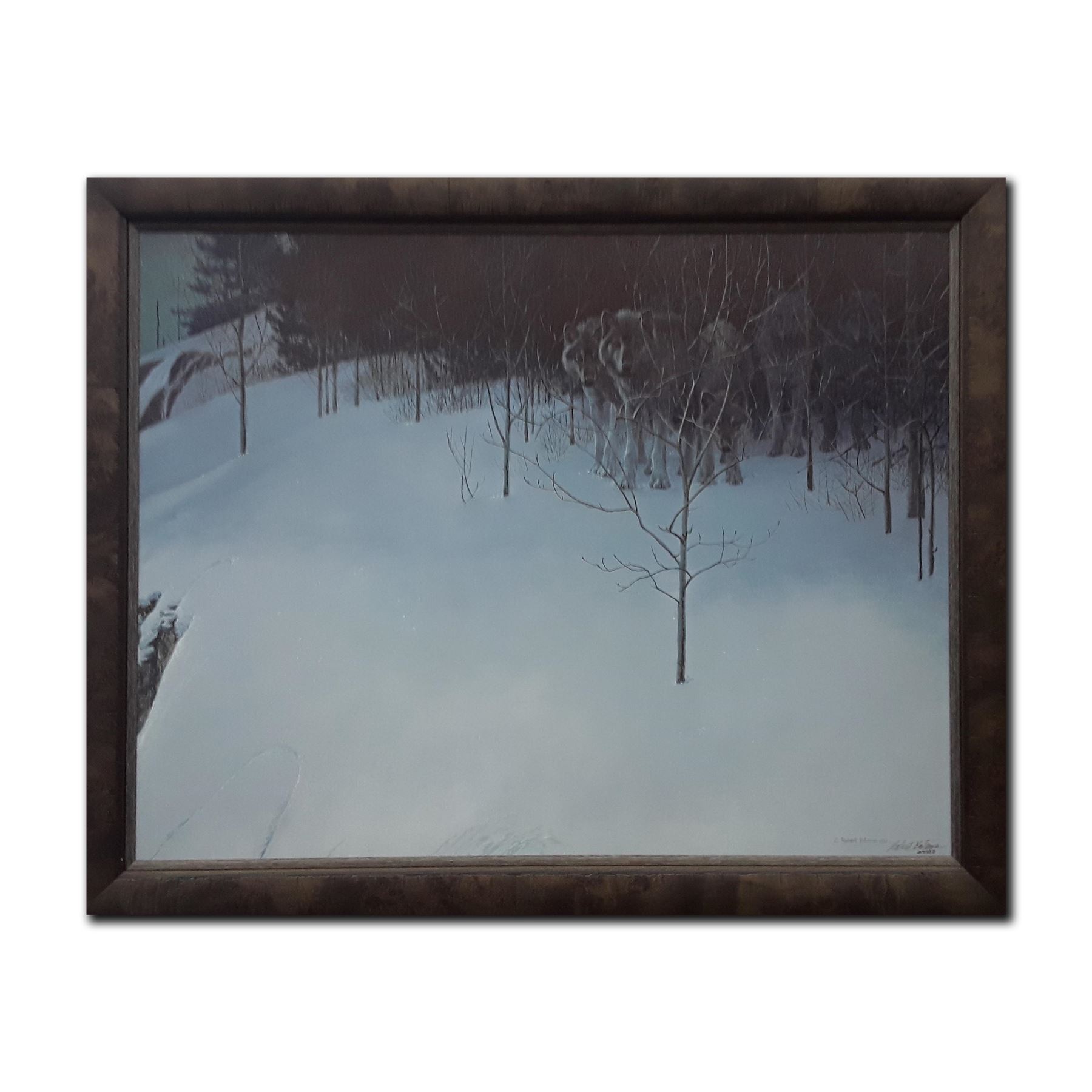 "I do not mean this to be a frightening picture. The wolves, which normally avoid eye contact, are staring straight at you. Although they sense your presence, they can?t quite make you out." - Robert Bateman. Image- 28 1/2" x 38 1/2". Frame- 36 1/2" x 46 1/2"