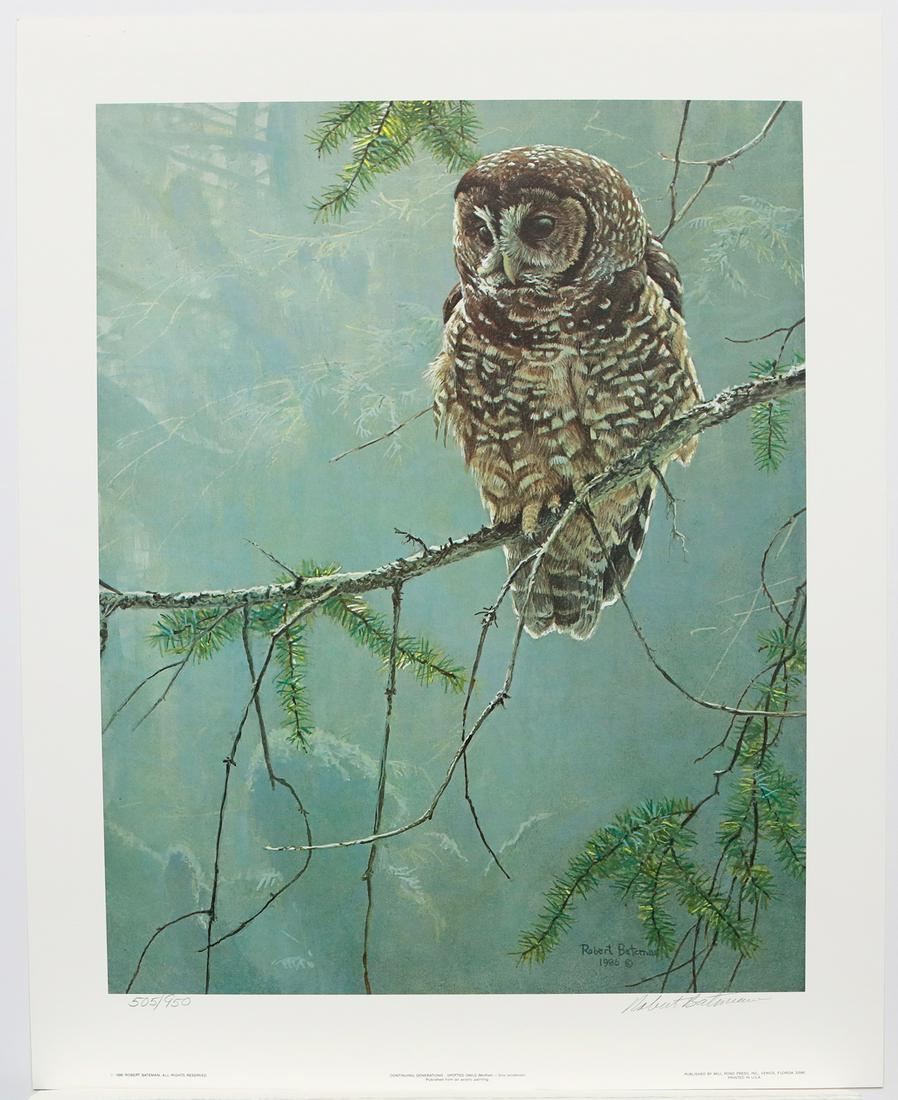 Robert Bateman's "Continuing Generations - Spotted Owl" Set of 2 limited edition prints signed and numbered 505/950. These prints are in mint condition and has never been framed. "The spotted owl is one of the rarest birds in North America. Since they require large acreage of old growth lowland forest, their existence is inevitably threatened by clear-cut lumbering activities. To me, the spotted owl represents almost a mystical spirit of the great western forest, as it was when white man first arrived. It would be a pity if the last of the owls were to vanish in this generation." - Robert Bateman. 20" x 15 1/4".