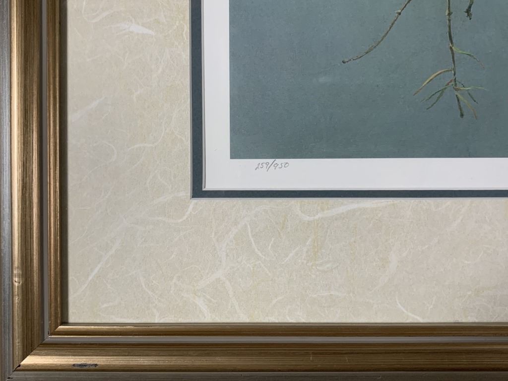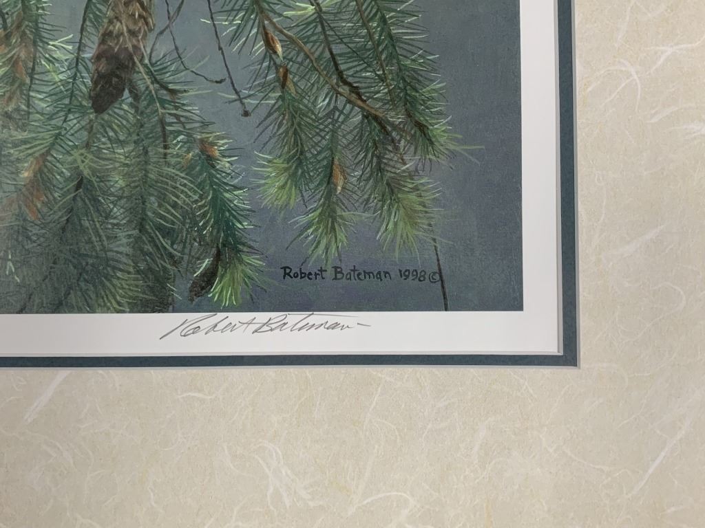 Robert Bateman's "Douglas Fir and Rufous  Hummingbird" limited edition print, signed and  numbered 259/950. This piece has been  professionally double matted using acid-free  matting, and has been custom framed under glass.