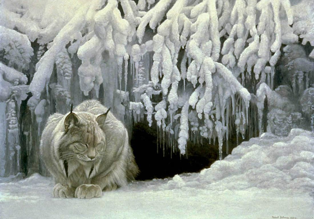Robert Bateman's "Dozing Lynx" limited edition canvas signed and numbered of an edition of 180. This canvas is in mint condition and has never been framed. "My painting shows the lynx in a late evening's tranquil moment at the entrance to a cave. It is at peace - lightly dozing prior to its night hunt." - Robert Bateman. 30" x 40".