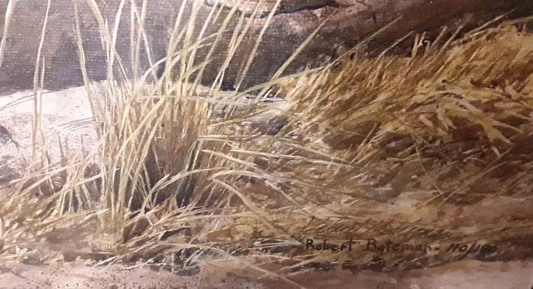"One of the very special things about elephants is their sense of family. Elephant society is matriarchal and is generally ruled by one of the older and wiser cows. I have seen a herd rally around a wounded member, showing great courage and loyalty in an attempt to protect one of their own from harm. Herds are usually composed of females and young. Sometimes bulls are tolerated for a while, depending on their attitude. As the young males mature and become troublesome, they are rejected by the herd. Then they wander around alone or in small bachelor groups. In this painting, I wanted to show an unremarkable mother elephant facing a potential threat with her trusting calf at her side. In the foreground is a trampled termite mound. The viewer might notice that the grass near the fallen tree is not trampled; no animal would walk or feed in that area because the tree is in the way." - Robert Bateman. 27" x 42".