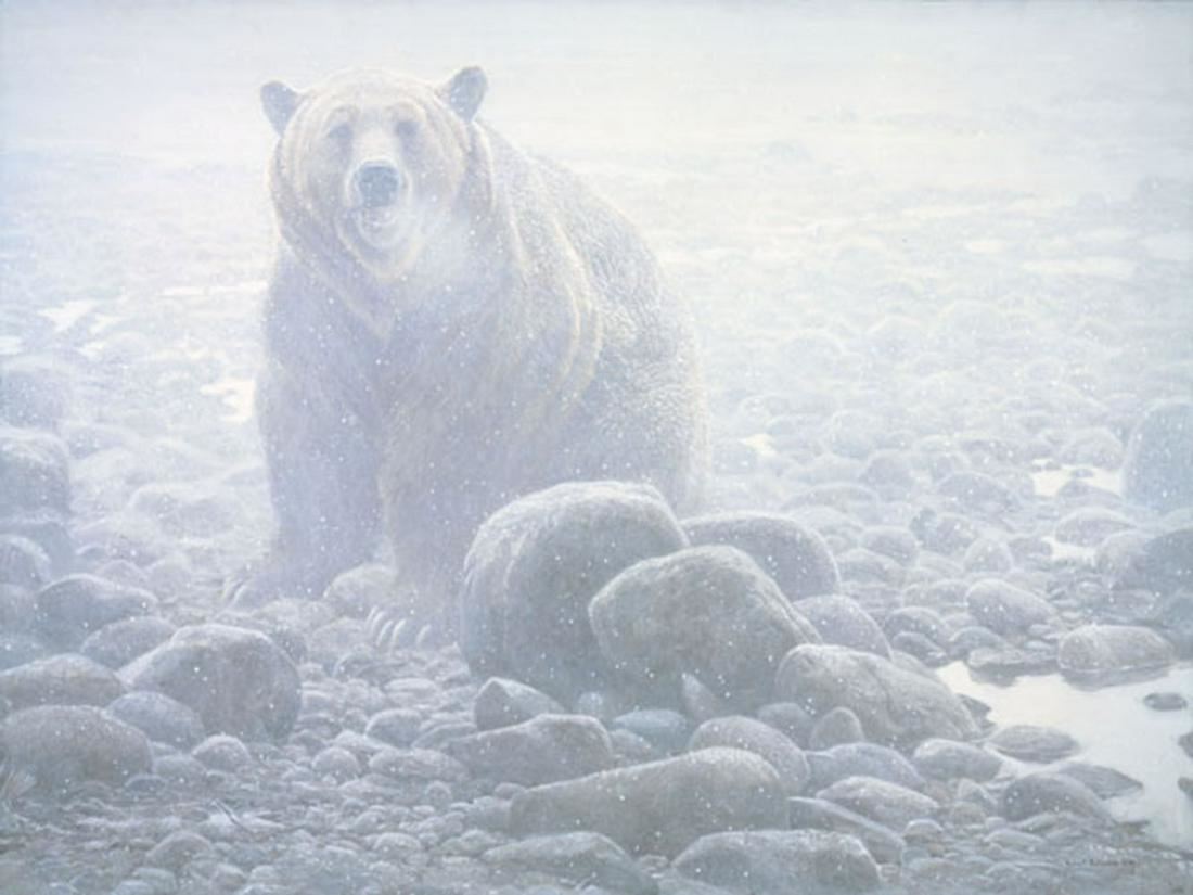 Robert Bateman's "End of Season - Grizzly" limited edition canvas signed and numbered 5/180. This canvas is in mint condition and has never been framed. "In this painting, I have shown a big male grizzly in a far from threatening mood. Winter is coming; he is fat, contented and getting sleepy. He has come down to the salmon river to look for a snack before curling up for hibernation." - Robert Bateman. 30" x 40".