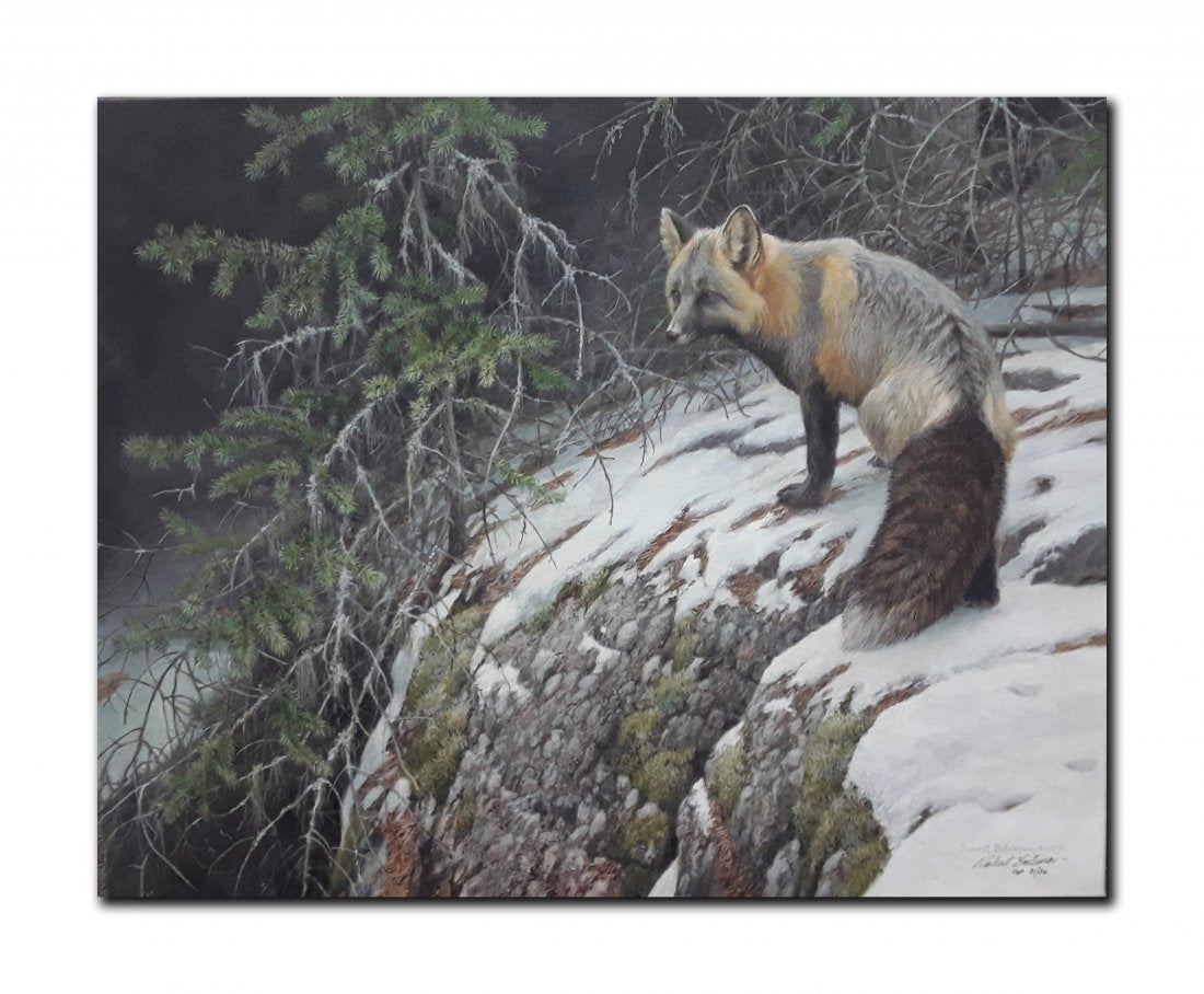 I featured the luxuriant tail, a very important asset to all foxes. This one is graced with a superb and abundant appendage. The tail, when wrapped around a sleeping fox's face and paws, becomes a muff and comforter with great insulation properties, but is easy to breathe through." - Robert Bateman. 24" x 30"