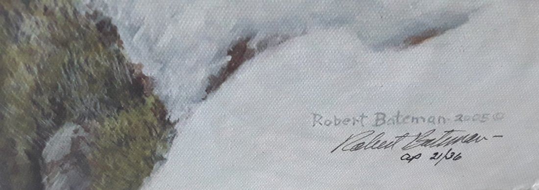 Robert Bateman's "Fox Crossing" limited edition canvas signed and numbered Artist Proof 21/36 AP. This canvas is in mint condition and has never been framed.
