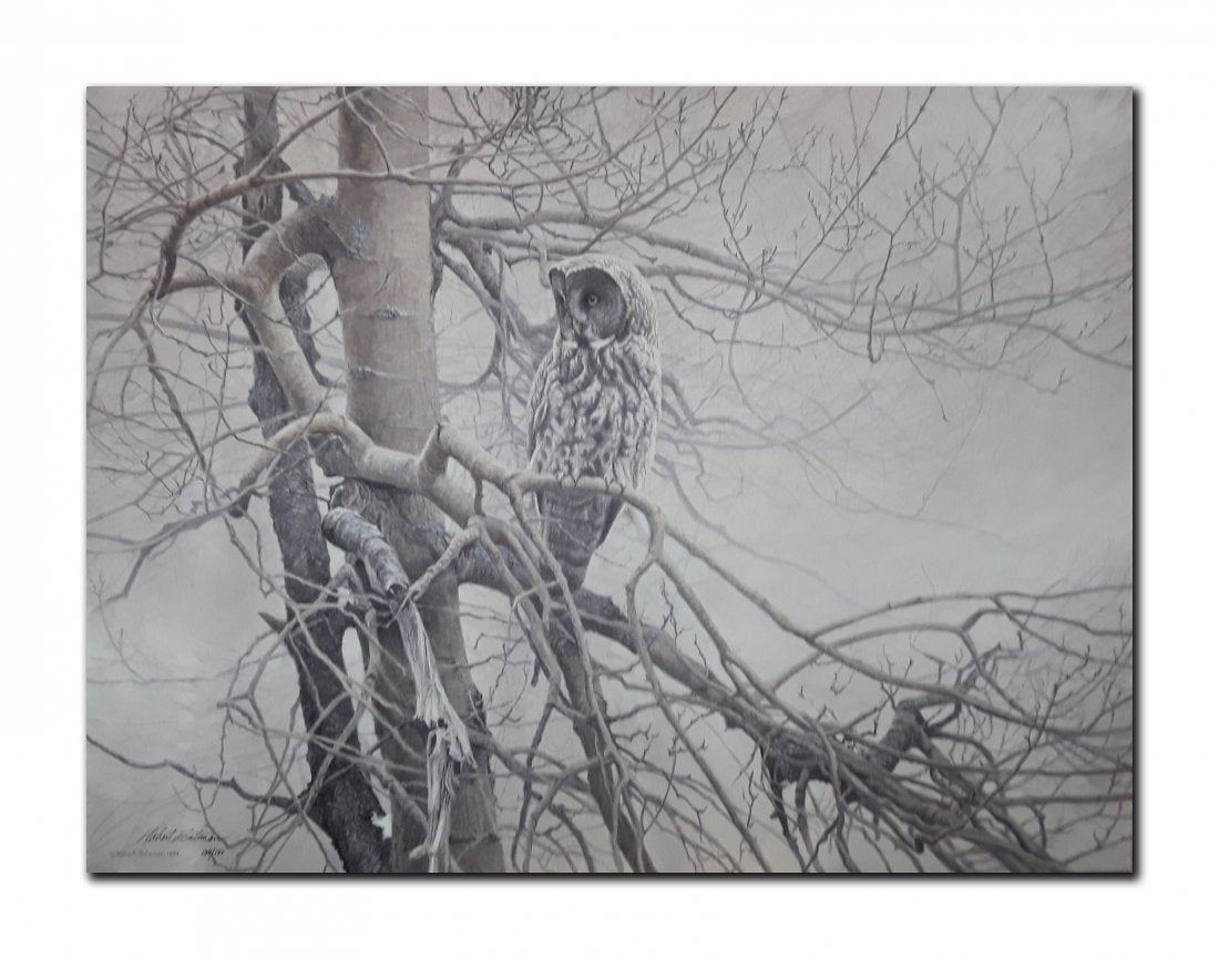 "The great gray owl is truly a ghost of the north. It is fleeting and silent. Its wing feathers have downy edges, making its flight totally silent. The colours are subdued, and the patterns provide excellent camouflage." - Robert Bateman. 30" x 40".