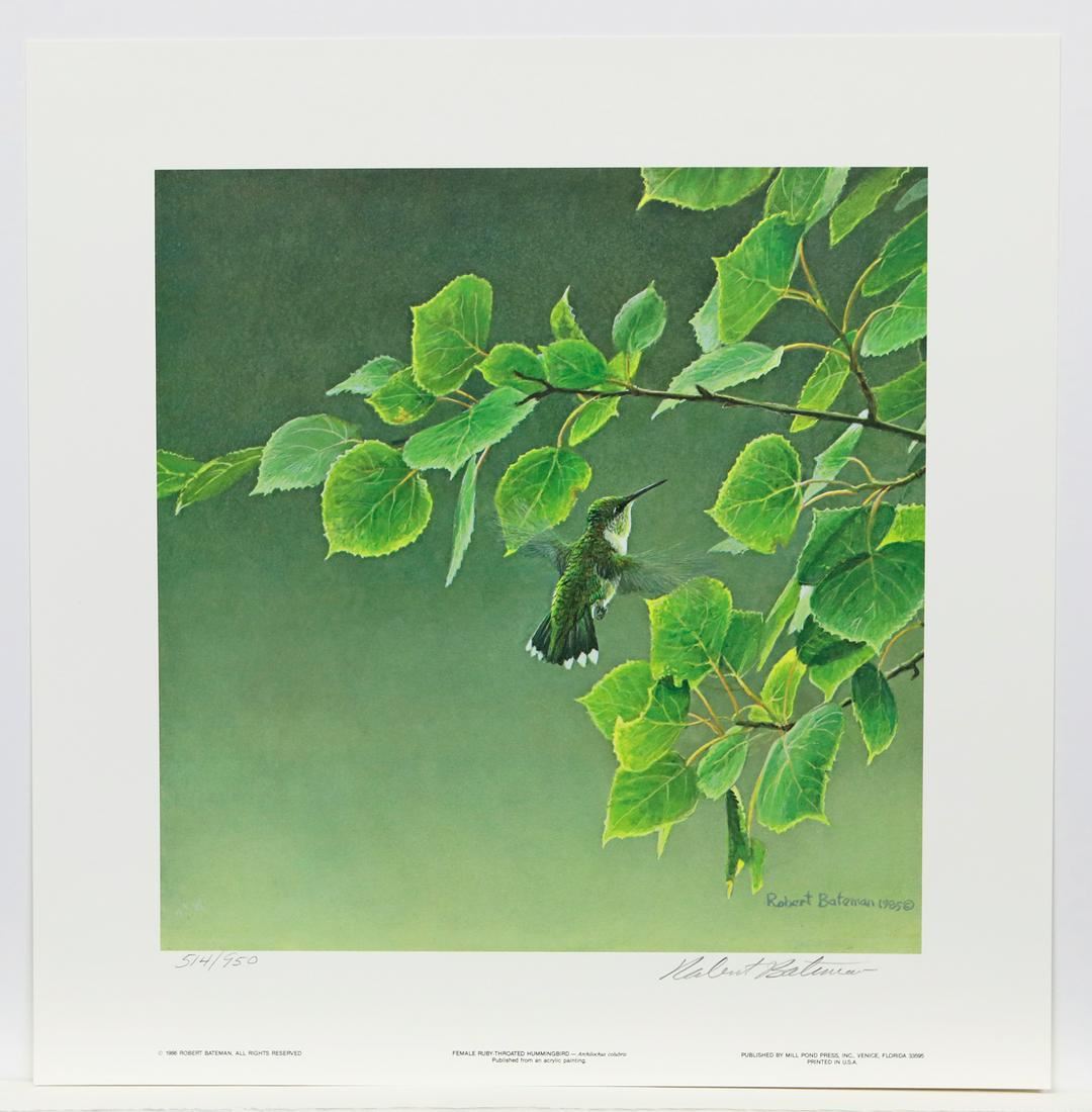 Robert Bateman's "Hummingbird Pair" set of 2 limited edition prints signed and numbered 514/950. These prints are in mint condition and has never been framed. "Hummingbirds are special. They are in some ways more like an insect than a bird. They are designed for flowers as are many insects. As most flowers are too delicate to perch on, the hummingbirds are very light so that they can hover, usually only touching the flowers with the tips of their tongues as they sip the nectar. The wings are virtually invisible, and their iridescent feathers flash brilliant and dull, depending on the angle of reflection. I have shown this pair as a diptych. The idea came from Japanese screens, which have an almost arbitrary breaking of a continuous scene. This somehow forces the viewer to see the scene in a fresh way and gives the composition an alternative significance. I was conscious of the parallel between the almost stained glass glow of the backlit aspen leaves and the burning iridescence of the hummingbirds' feathers." - Robert Bateman. 15 1/4" x 15".