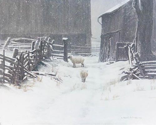 Robert Bateman's "In For The Evening" limited edition canvas signed and numbered 117/180. This canvas is in mint condition and has never been framed. "There are still places where one can see the timeless activities of man and nature. Although this is a scene which happened a short time ago near my own home it could have happened, in every detail, a century ago. The corral leading to the barnyard is fenced with split cedar rails. The siding on the barn probably came from the original white pine on the property, and as the gentle snow drifts down, the sheep are slowly making their way to the protection of the barnyard for the night. The flat, almost abstract patterns of white on gray and gray on white reminded me of an old photograph or etching." - Robert Bateman. 20" x 24".
