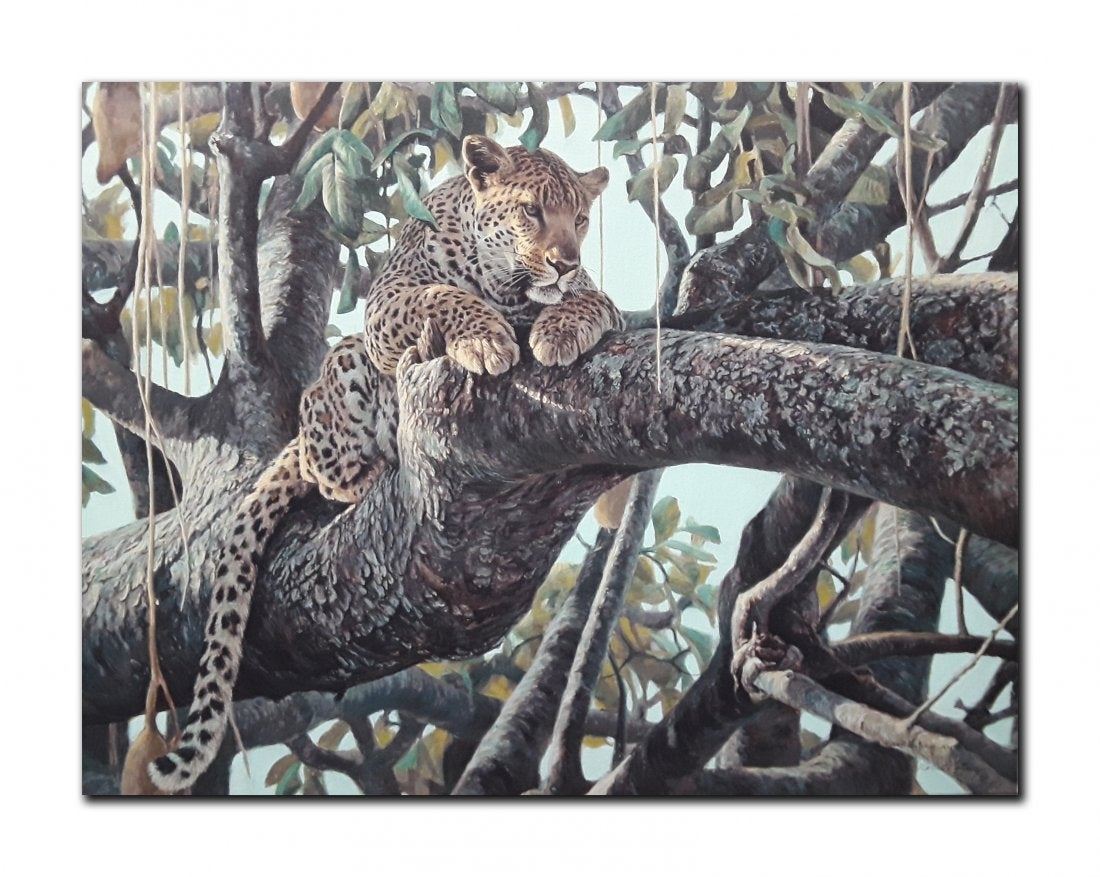 "The leopard glides through the branches of the sausage tree without effort or sound and instantly blends with the convoluted limbs. The coolness of his attitude in his green, airy world reminded me of the atmosphere of a tropical cafe - exotic and relaxed." - Robert Bateman. 36" x 28".