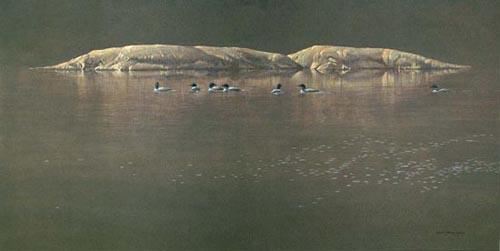 Robert Bateman's "Loon Gathering At Big East" limited edition canvas signed and numbered of an edition of 180. This canvas is in mint condition and has never been framed. "From my childhood, my joy was to explore the lakes in the Canadian northland. The spirit of those lakes was, and still is, the common loon. They sometimes assemble in quite large numbers before their southward flight. That is the subject of this painting." - Robert Bateman. 20" x 40".