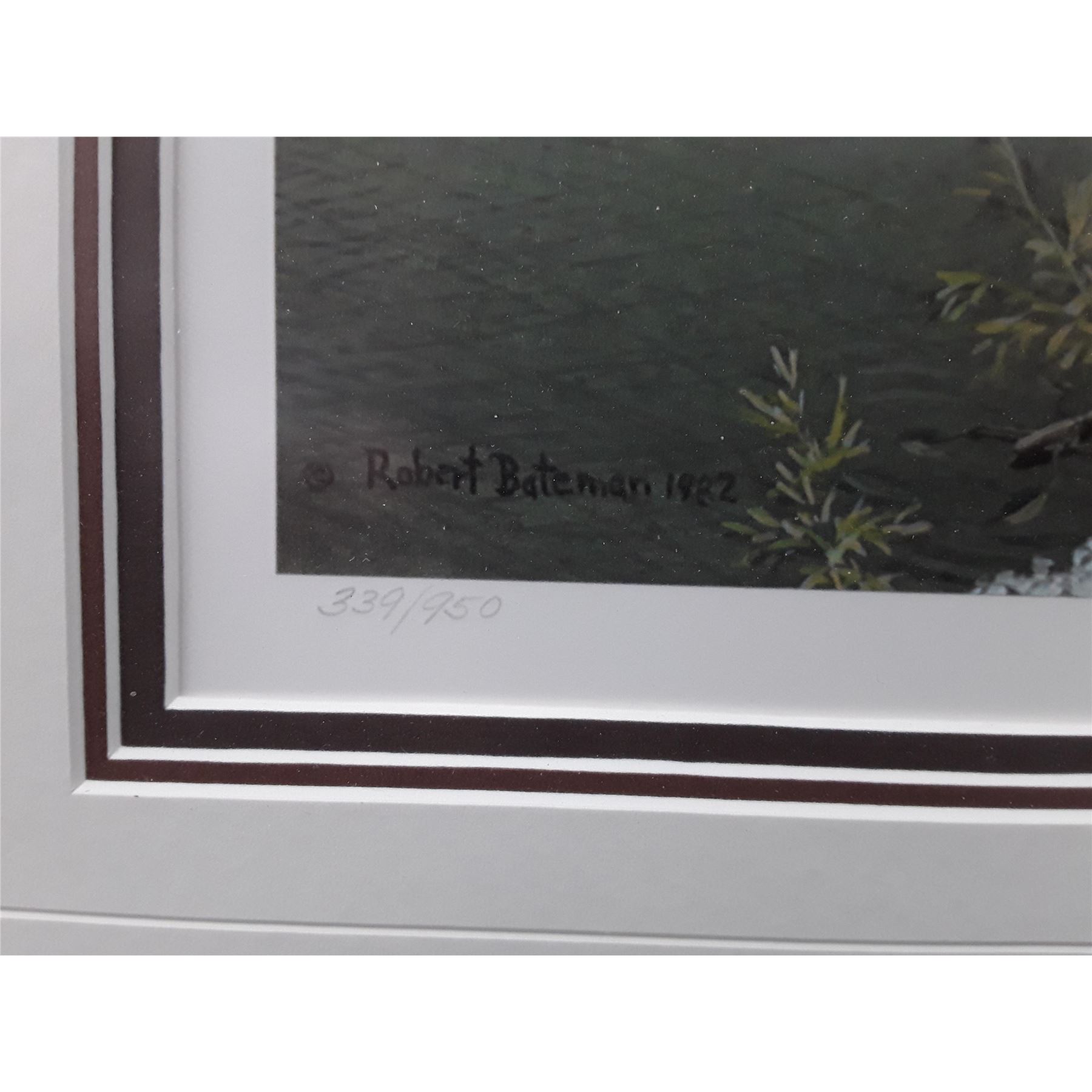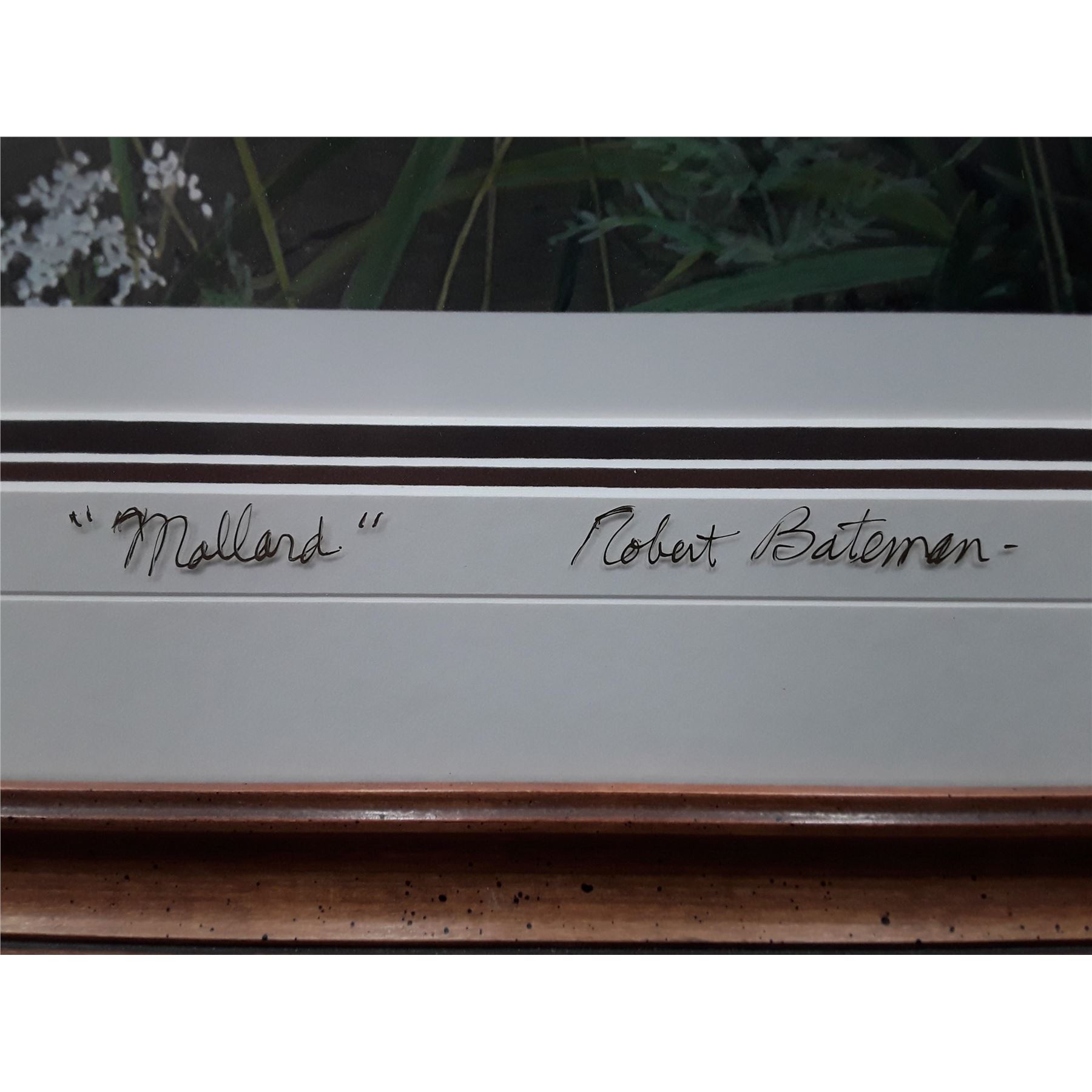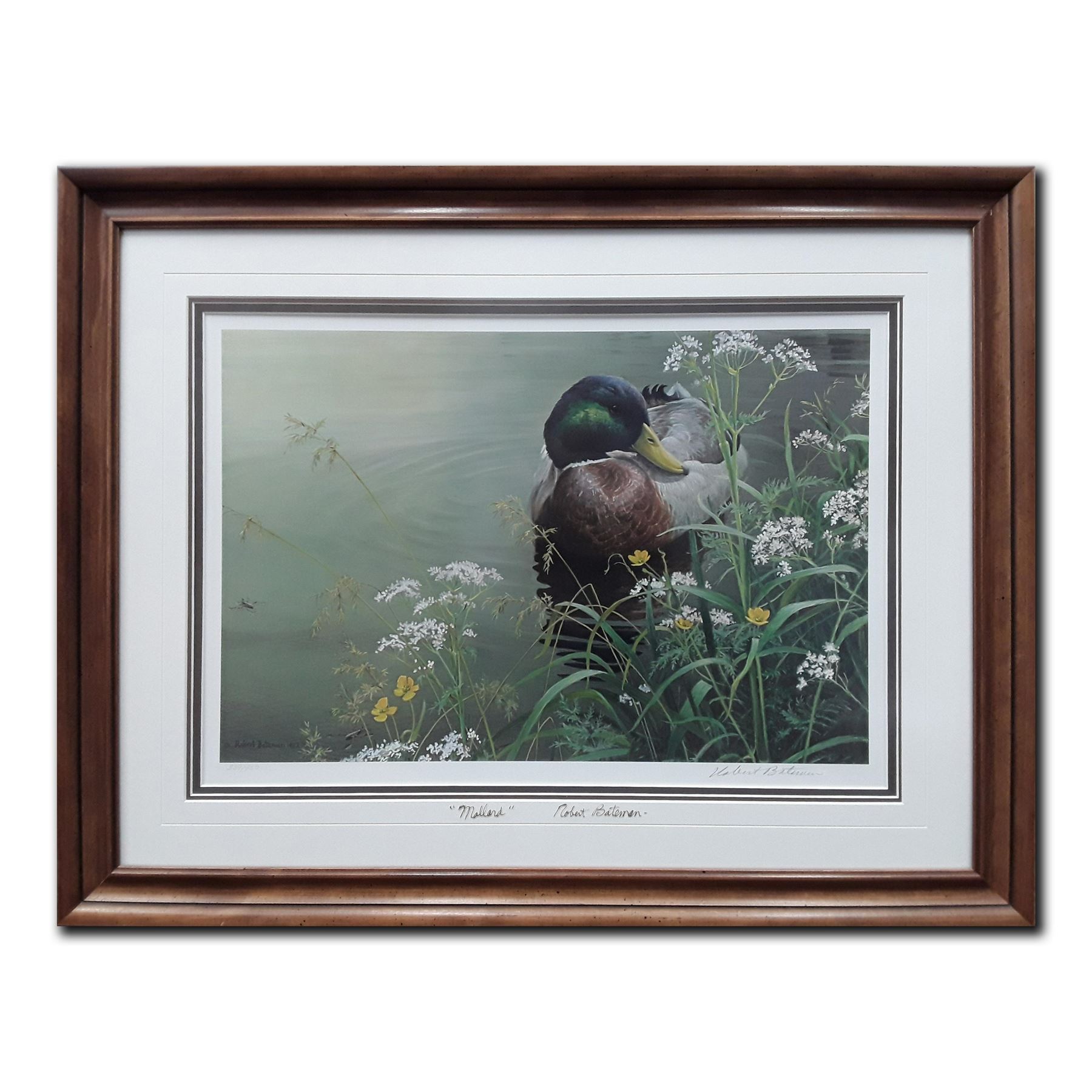 Robert Bateman's "Meadows Edge- Mallard" limited edition print signed and numbered 339/950. This has been professionally triple matted with acid free matting and custom framed under glass. The glass has been signed by Robert Bateman.