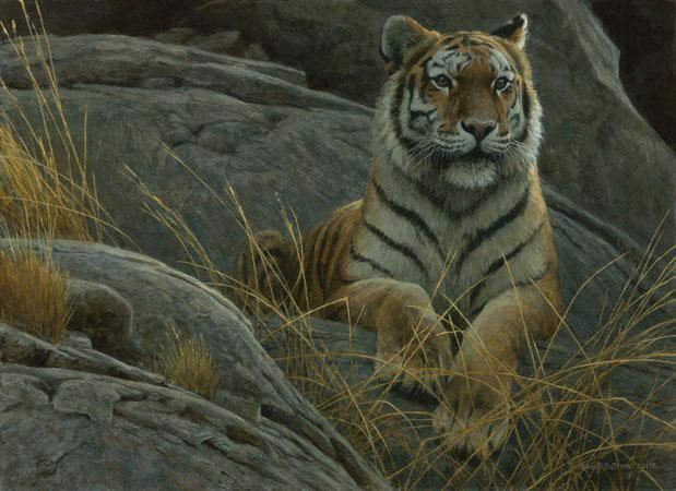 Robert Bateman's "Monarch of Asia" limited edition canvas signed and numbered of an edition of 180. This canvas is in mint condition and has never been framed. "Growing up, I never dreamed I would see a tiger in the wild. My mother was 2 when Queen Victoria died so my childhood was filled with stories of the Victorian age, including the time of the British Raj in India. Photos of the ghastly spoils of tiger shoots were commonplace. Thank goodness attitudes have changed toward this so-called 'sport'. Now the threat is the big money behind Asian traditional medicine. Birgit and I saw our first tiger in the wild while bird watching in Assam. Across a body of water, in plain view a tiger stalked and charged a herd of marsh deer. The deer all escaped. On a more recent birding trip we saw 15 tigers in the wild in 4 different parks. This painting is like most of my art, a combination of many different reference sources - perhaps 10 different tigers from the wild and from zoos. The rocks and grasses are also created from different sources. I used the rhythm of the rocks and grasses to echo the bounding movement of the tiger when on the chase. The lighting was contrived to give a sense of drama and mystery befitting this magnificent animal." - Robert Bateman. 16" x 22".