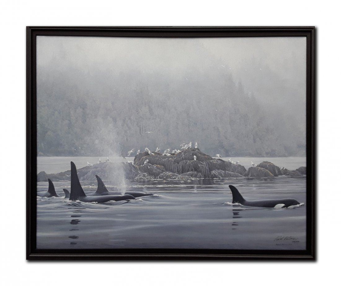 ?'Orca' is the generic name for the 'killer whale.' Most people now prefer to use the name 'orca,' as 'killer' is a pejorative term. After all, every meat-eating creature is a killer. Orca is much more dignified. Dignity is the name that applies to these creatures. They are big and very impressive in their speed, intelligence and power. - Robert Bateman. Image- 26 1/2" x 37 1/2". Frame- 34" x 45"