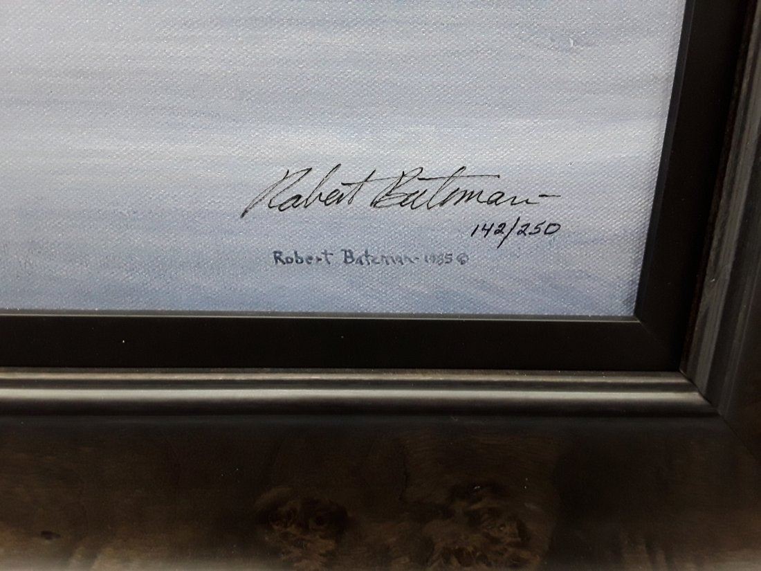 Robert Bateman's "Orca Procession" limited edition canvas signed and numbered 142/250. This has been professionally framed and custom matted with acid free matting. Certificate of authenticity included.