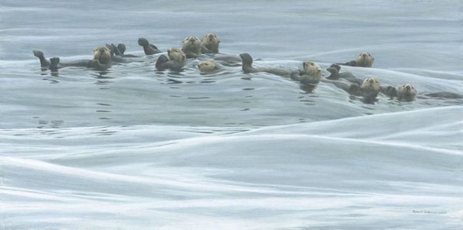 Robert Bateman's "Raft of Otters" limited edition canvas signed and numbered 35/180. This canvas is in mint condition and has never been framed. "Alaska was sold by Russia to America in 1867 for 7.2 million dollars (2¢ an acre). The major reason for a Russian presence in the North American continent was the fur trade. By far, the most precious of the fur-bearing animals was the sea otter. Their underfur has 150,000 hairs per square centimeter. Over 1 million of these animals were killed for their fur beginning in the 18th century. They were also quite easy to catch since they are gregarious and float around in 'rafts' of up to several hundred. By the mid 19th century their numbers were dwindling and the market for furs had changed. Alaska, being a great distance from the centre of power of Russia in the far west, became of less interest to its rulers. The Sea otters were close to extinction for most of the 20th century but a number of colonies were introduced along the Pacific coast of America and now they are spreading across their former range. On a recent fishing trip to south-east Alaska we saw many "rafts" of these creatures. Their blond, furry heads and inquisitive expressions give them an endearing and appealing quality." - Robert Bateman. 20" x 40".