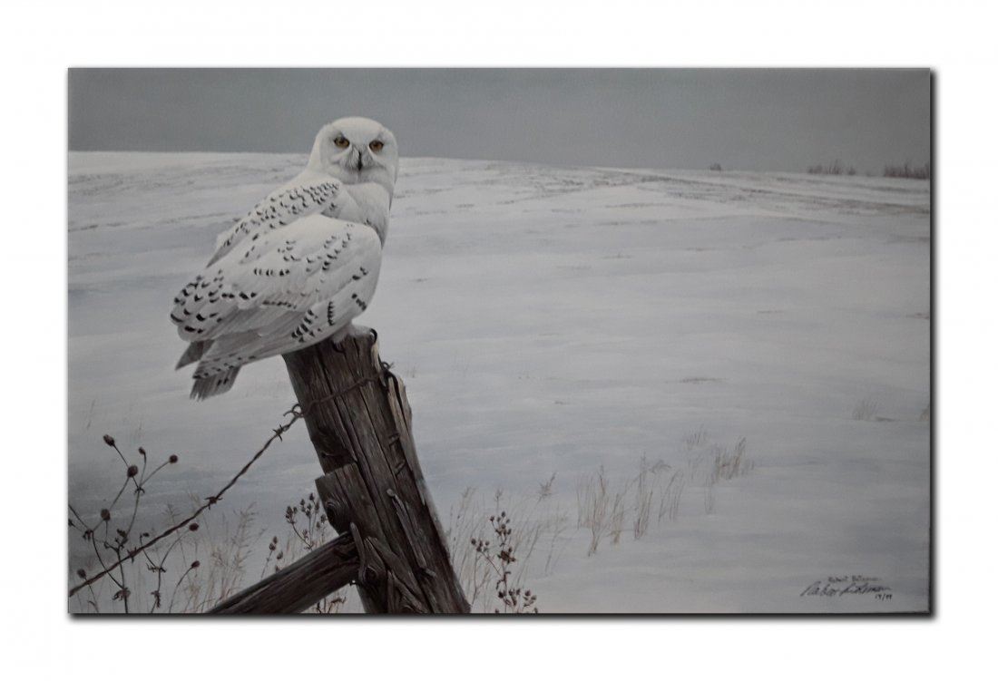 The owl I have shown is perched on an old cedar post. I enjoy the way the elements work on the installations of our pioneer forefathers. On some long forgotten day, the farmer placed that post and subsequently put in the nails and staples. The reason is no longer evident, but for the owl it doesn't matter. The post is a perfect place from which to begin his hunt." - Robert Bateman. 19" x 28.5"