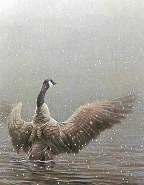 Robert Bateman's "Stretching - Canada Goose" limited edition canvas signed and numbered of an edition of 180. This canvas is in mint condition and has never been framed. "This painting is a celebration of the dynamic majesty of the Canada goose. He is proudly rearing up and stretching, perhaps to shake the snow off his feathers. Every muscle is straining, and all of the feather tracts are fanned, producing the most exciting rippling rhythms." - Robert Bateman. 36" x 28".