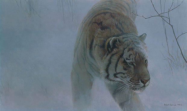 Robert Bateman's "Twilight Siberian Tiger" limited edition canvas signed and numbered of an edition of 180. This canvas is in mint condition and has never been framed. "Night is the time of the tiger. He moves carefully and quietly through the blue world of late dusk in winter. Although it is misty, he has no problem seeing. Because the snow makes a pale background, he can easily be seen in this open woodland by his prey species, the elk. But there are greater difficulties facing this tiger and all of his wild brethren. I have painted this tiger almost vanished in the evening mists. I hope that present trends can be reversed before the wild population vanishes." - Robert Bateman. 20" x 30".