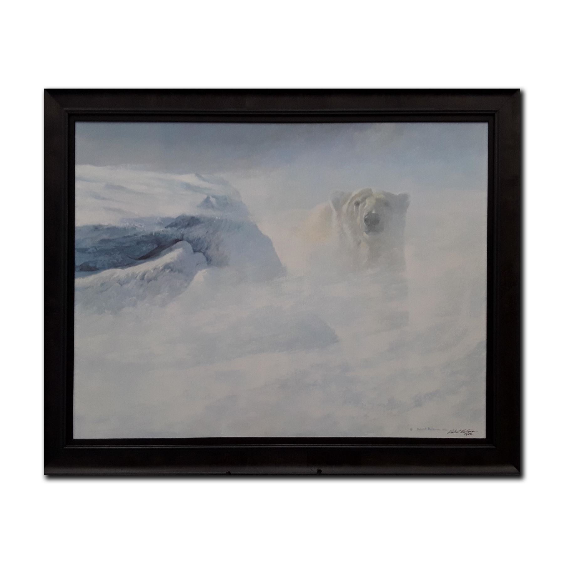"What if, traveling the arctic, you entered a blowing snow drift and, unknown to you, a polar bear entered from the other side? By the time you both knew this, it would be too late. This painting is the way I expressed the discovery. - Robert Bateman. Image- 30 1/2" x 41 1/2". Frame- 38" x 48".