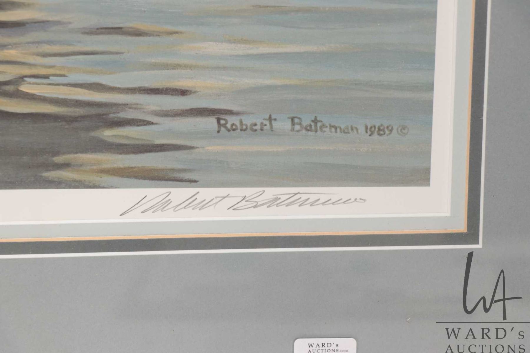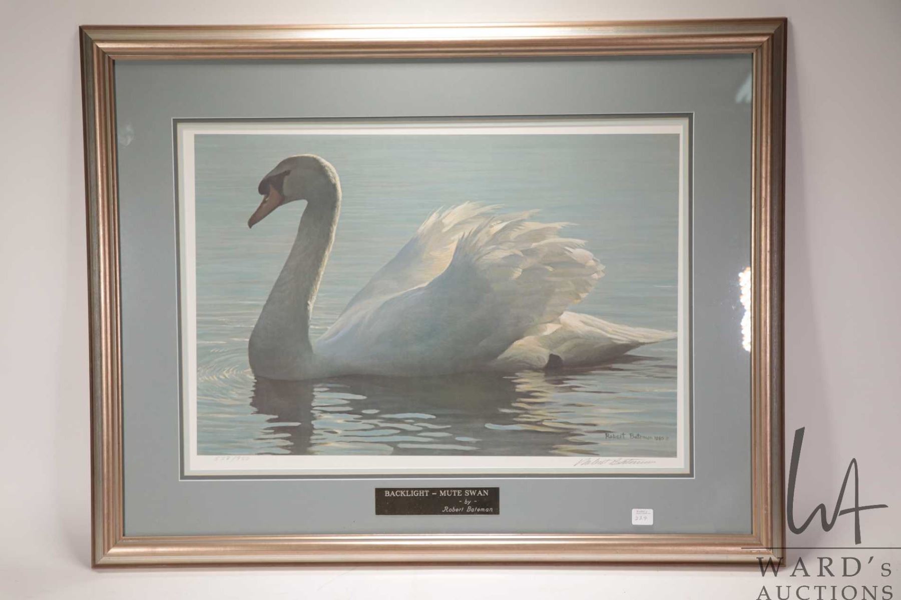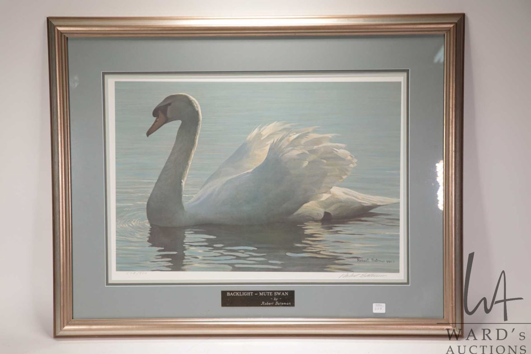 Robert Bateman signed limited edition print, titled "Back Light-Mute Swan" 538/950, pencil signed by artist, overall dimension including frame 26" X 33". Note: Not available for shipping. Local pickup only
